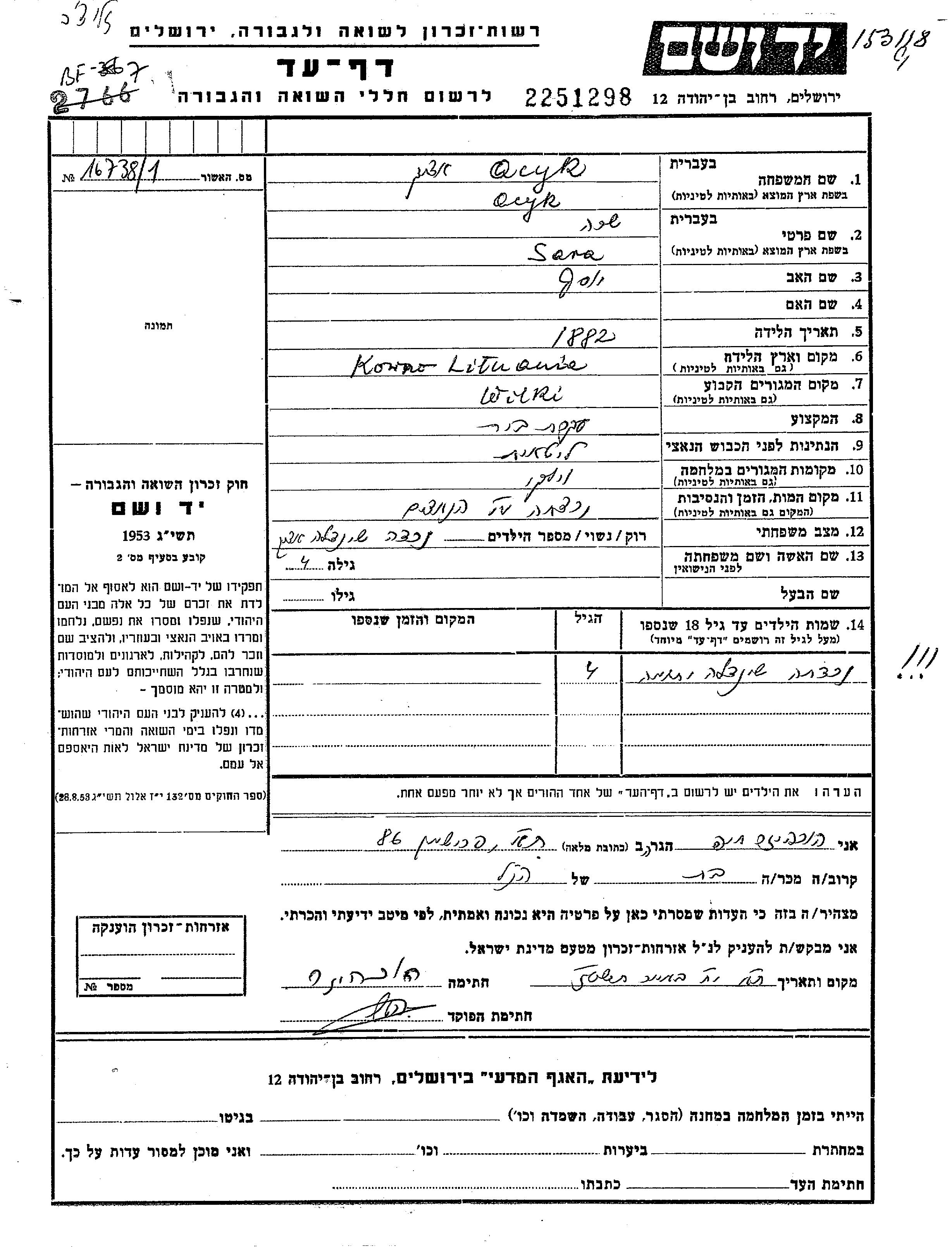 Sara wurde in der Schoah ermordet. Todesort: Wilno, Polen.