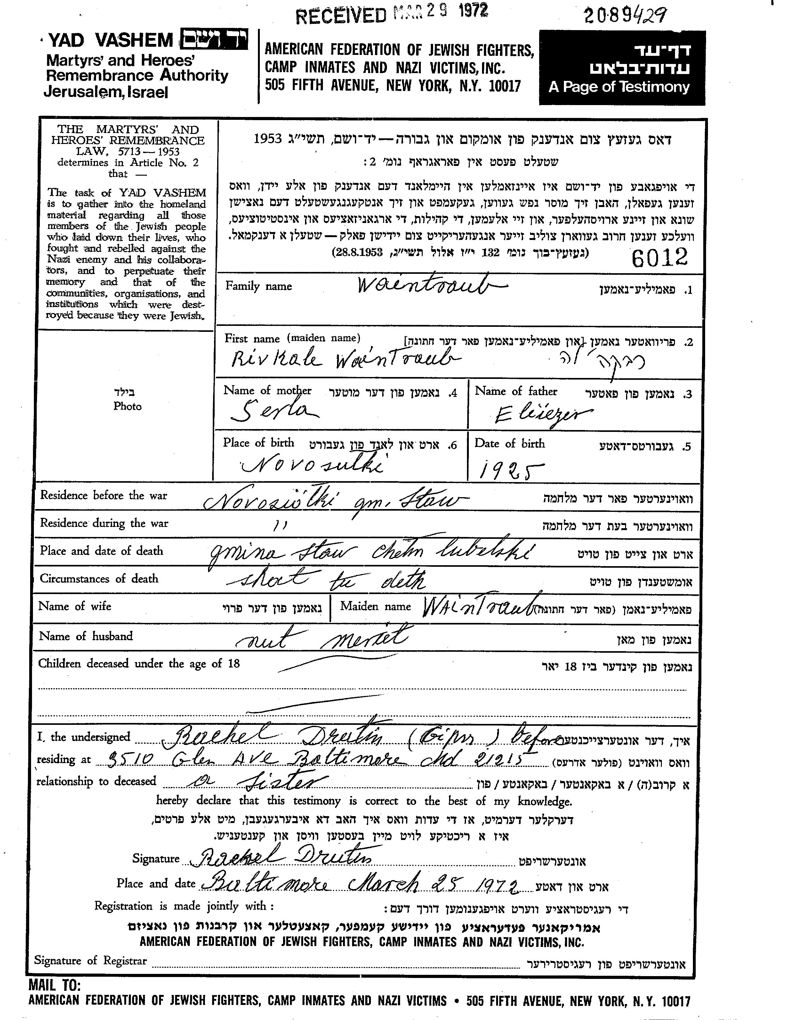 Rivkale Waintraub wurde im Jahr 1925 in Nowosiółki, Polen geboren. Sie war die Tochter von Eliezer und Seril, geb. Shnaier. Vor dem Zweiten Weltkrieg lebte sie in Nowosiółki, Polen. Während des Krieges war sie in Nowosiółki, Polen.