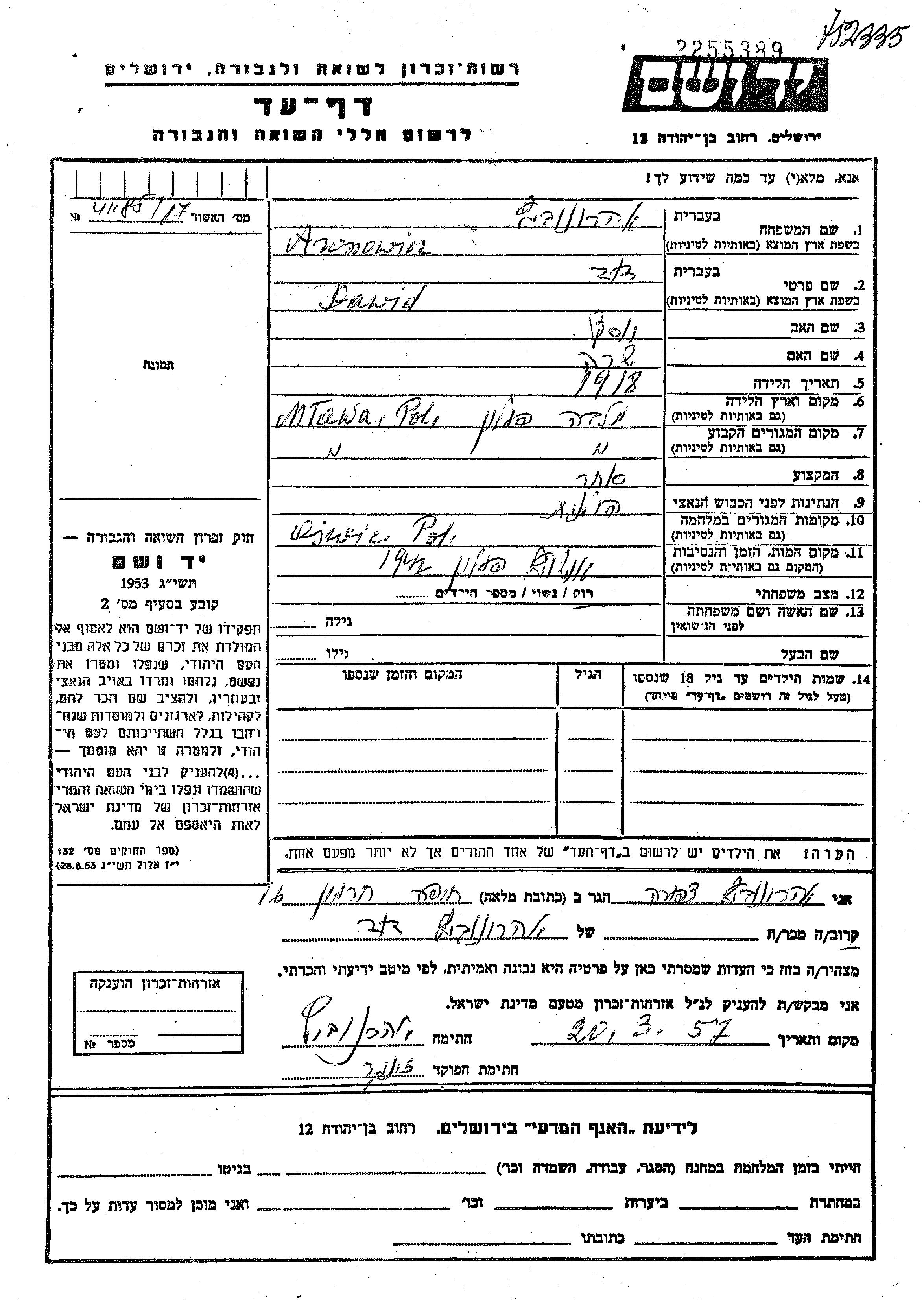 Dawid Aronowicz wurde im Jahr 1918 in Mlawa, Polen geboren. Er war der Sohn von Josef und Sara, geb. Vina. Er war Kaufmann/-frau und Ledig. Vor dem Zweiten Weltkrieg lebte er in Mlawa, Polen. Während des Krieges war er in Mlawa, Polen.