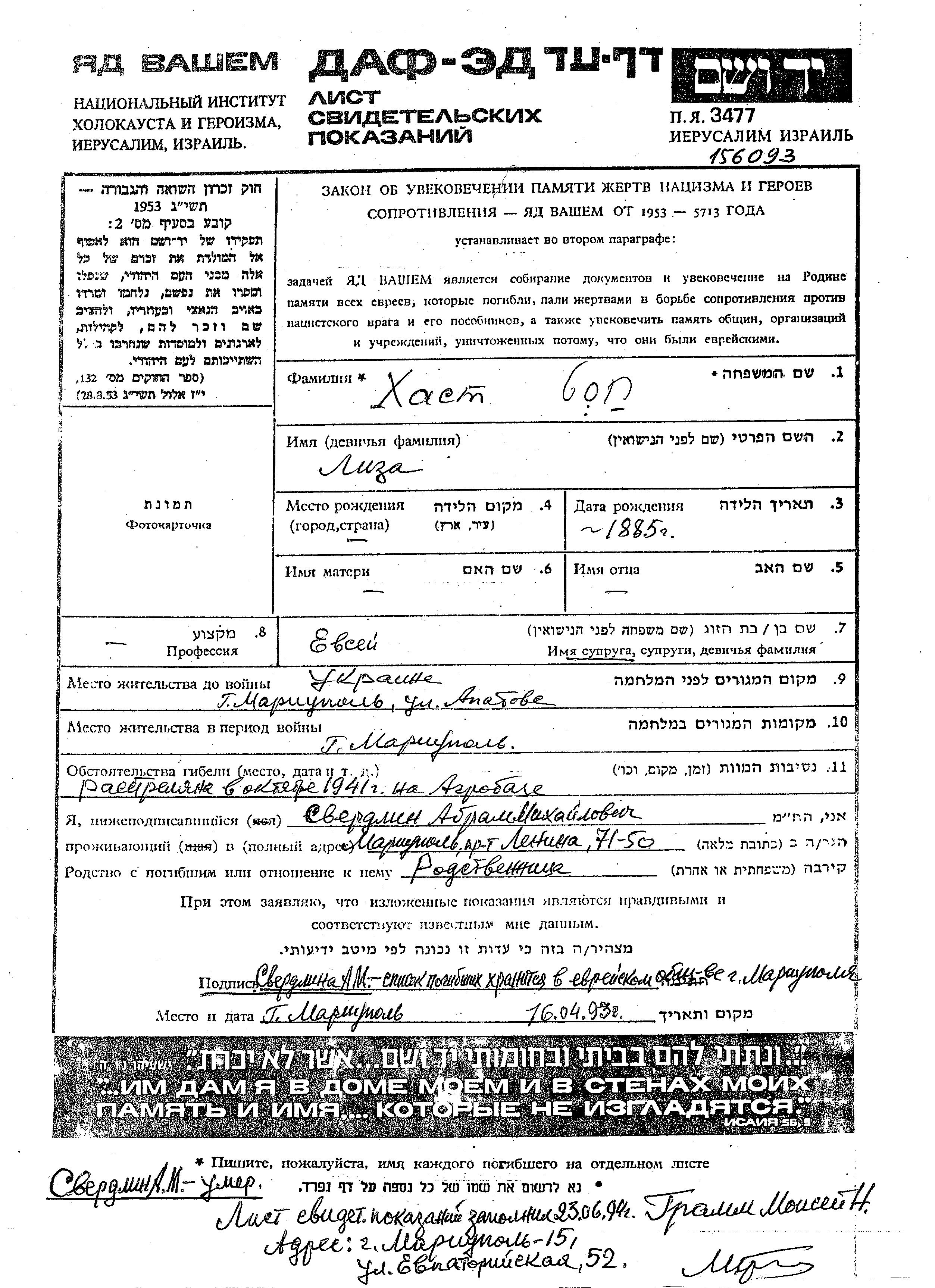 Liza Khast wurde im Jahr 1885 geboren. Sie war mit Yevsei Verheiratet. Vor dem Zweiten Weltkrieg lebte sie in Mariupol, Ukraine (UdSSR). Während des Krieges war sie in Mariupol, Ukraine (UdSSR).