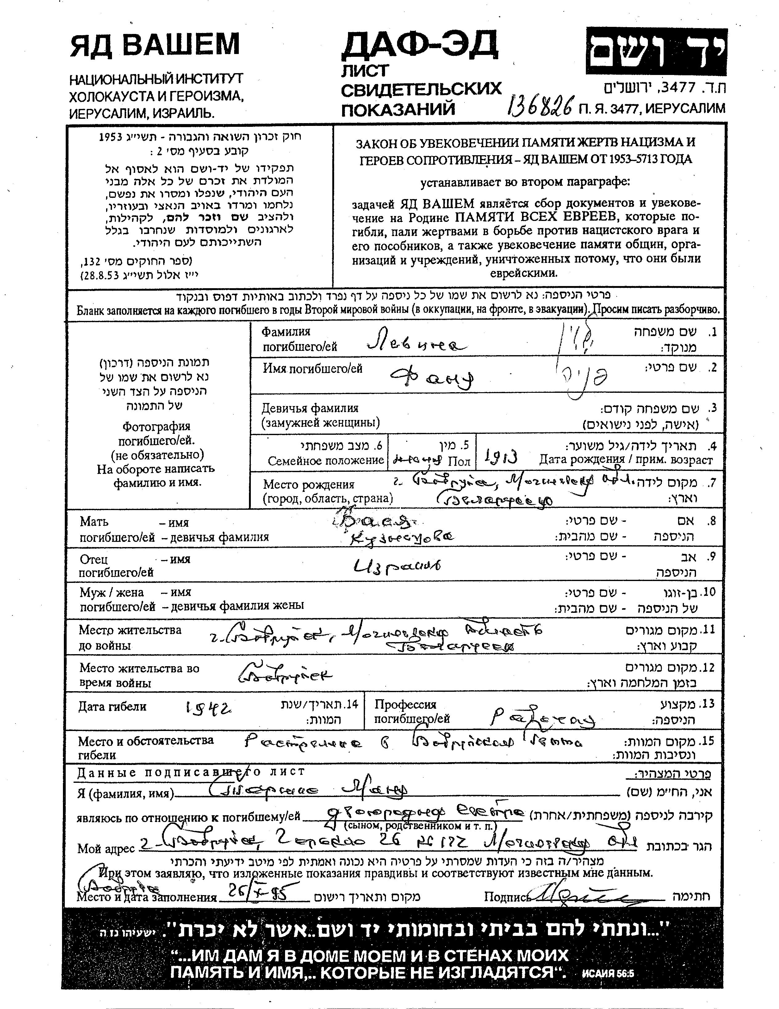 Fania Levin wurde im Jahr 1913 in Bobruysk, Weißrussland (UdSSR) geboren. Sie war die Tochter von Izrail und Basia, geb. Kuznetsov. Sie war Arbeiter/-in. Vor dem Zweiten Weltkrieg lebte sie in Bobruysk, Weißrussland (UdSSR). Während des Krieges war sie in Bobruysk, Weißrussland (UdSSR).