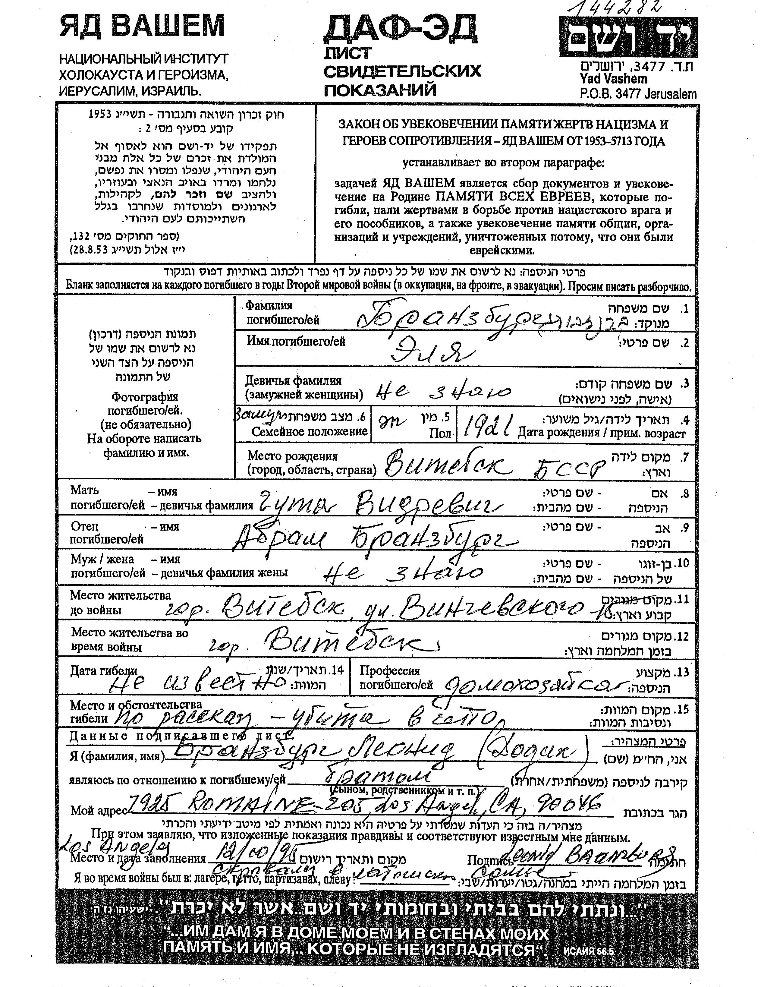 Elia Alia Branzburg wurde im Jahr 1921 in Vitebsk, Weißrussland (UdSSR) geboren. Sie war die Tochter von Abram und Gutia, geb. Vidrevich. Sie war Hausfrau und Verheiratet. Vor dem Zweiten Weltkrieg lebte sie in Vitebsk, Weißrussland (UdSSR). Während des Krieges war sie in Vitebsk, Weißrussland (UdSSR).
