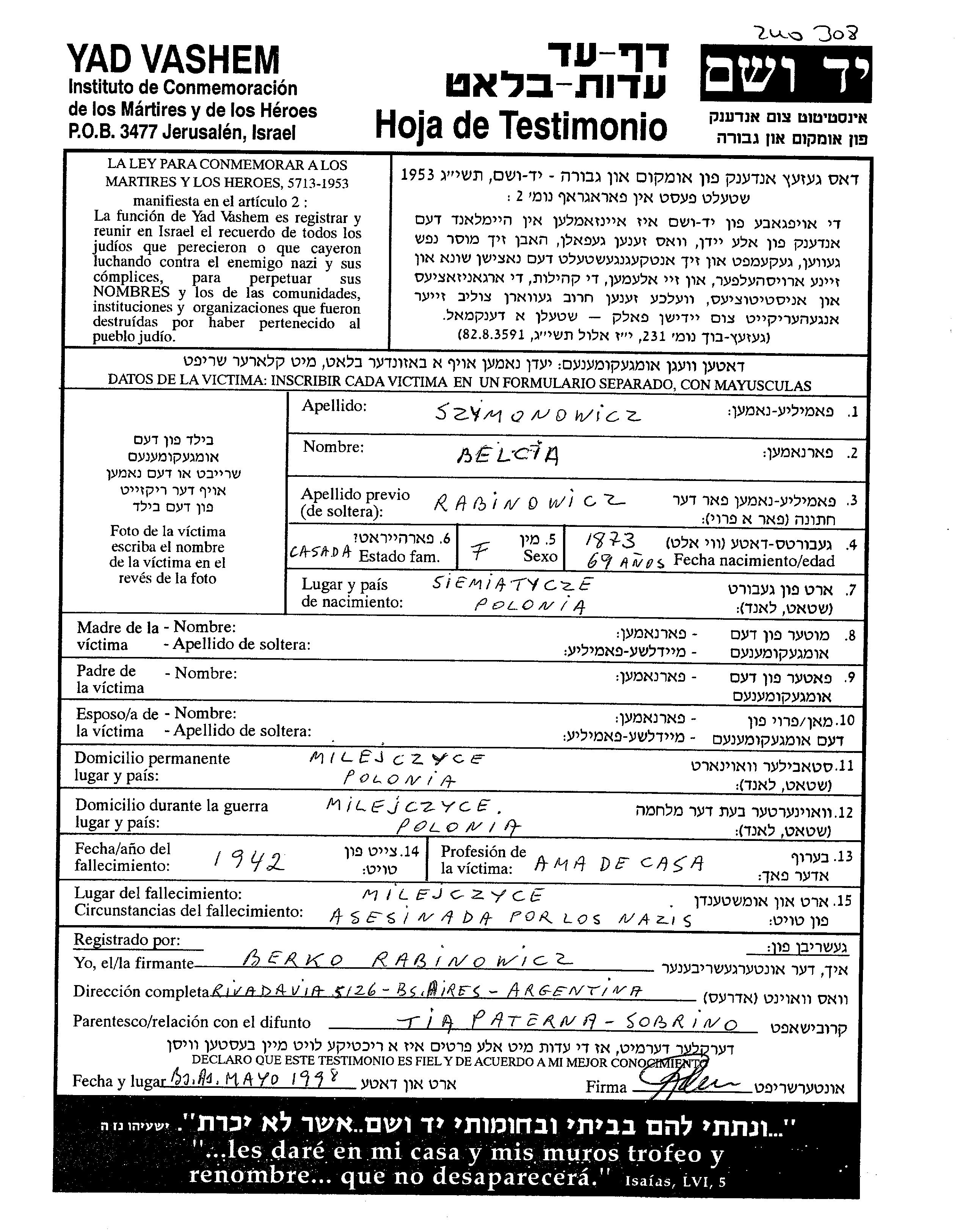 Belcia Szymonowicz, geb. Rabinowicz wurde im Jahr 1873 in Siemiatycze, Polen geboren. Sie war Hausfrau und Verheiratet. Vor dem Zweiten Weltkrieg lebte sie in Milejczyce, Polen. Während des Krieges war sie in Milejczyce, Polen.
