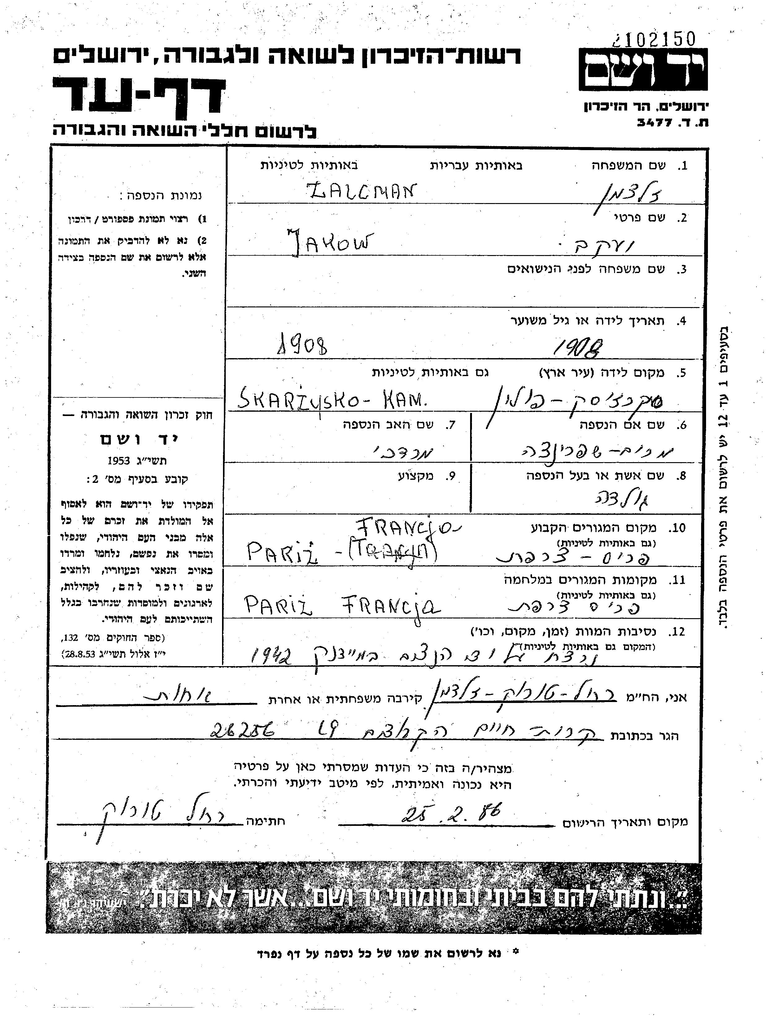 Jakow Zalcman wurde im Jahr 1908 in Skarzysko Kamienna, Polen geboren. Er war der Sohn von Mordechai und Miryam Shprintza. Er war mit Golda Verheiratet. Vor dem Zweiten Weltkrieg lebte er in Paris, Frankreich. Während des Krieges war er in Paris, Frankreich.
