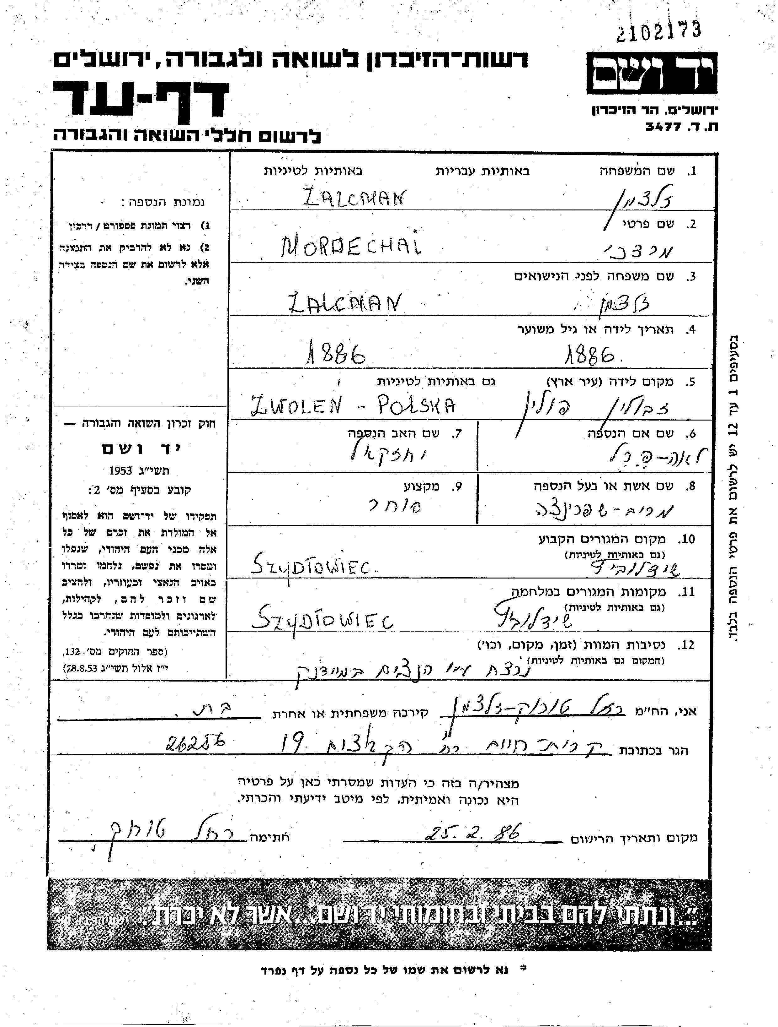 Mordechai Zalcman Zalman wurde im Jahr 1886 in Zwolen, Polen geboren. Er war der Sohn von Yekhizkel und Perl Lea. Er war Kaufmann/-frau. Vor dem Zweiten Weltkrieg lebte er in Szydlowiec, Polen. Während des Krieges war er in Szydlowiec, Polen.