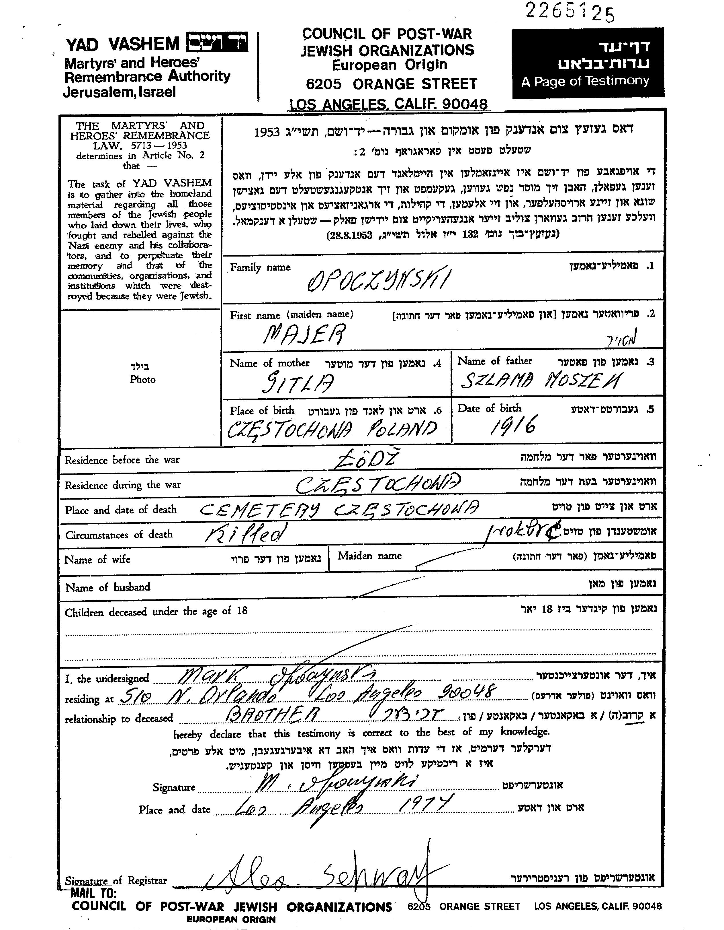 Majer Opoczynski wurde im Jahr 1916 in Czestochowa, Polen geboren. Er war der Sohn von Szlama Moszek und Gitla, geb. Szpiro. Er war Ledig. Vor dem Zweiten Weltkrieg lebte er in Lodz, Polen. Während des Krieges war er in Czestochowa, Polen.