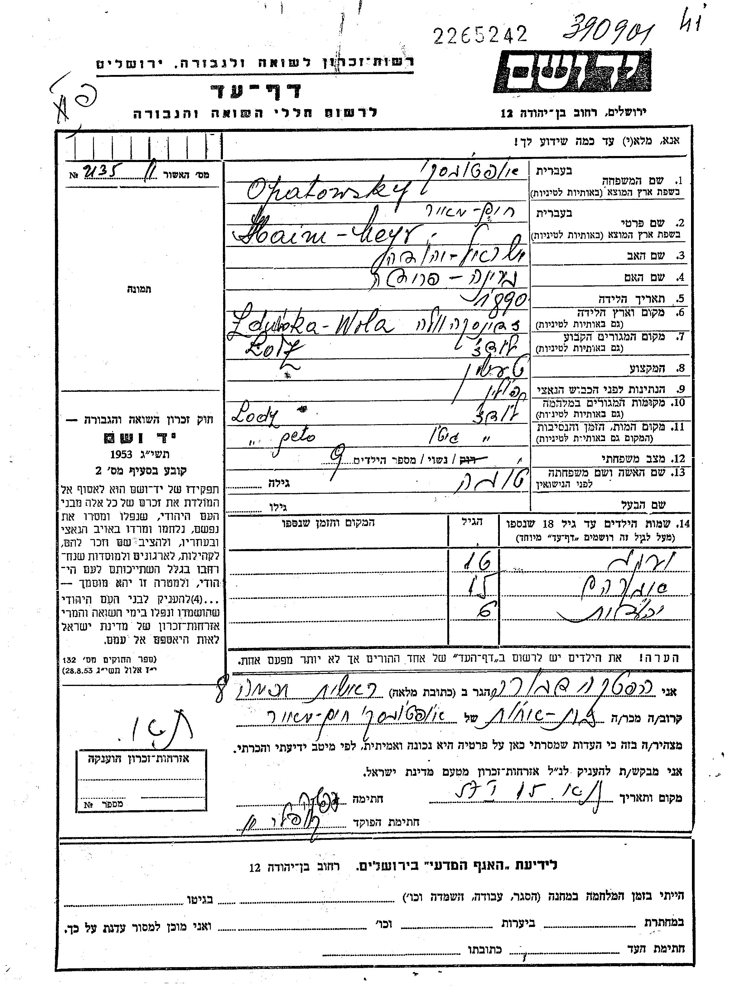 Haim Meyr Opatowsky wurde im Jahr 1890 in Zdunska Wola, Polen geboren. Er war der Sohn von Israel Yehuda und Braina Frida. Er war Industrielle/-r und mit Tova Verheiratet. Vor dem Zweiten Weltkrieg lebte er in Lodz, Polen. Während des Krieges war er in Lodz, Polen.