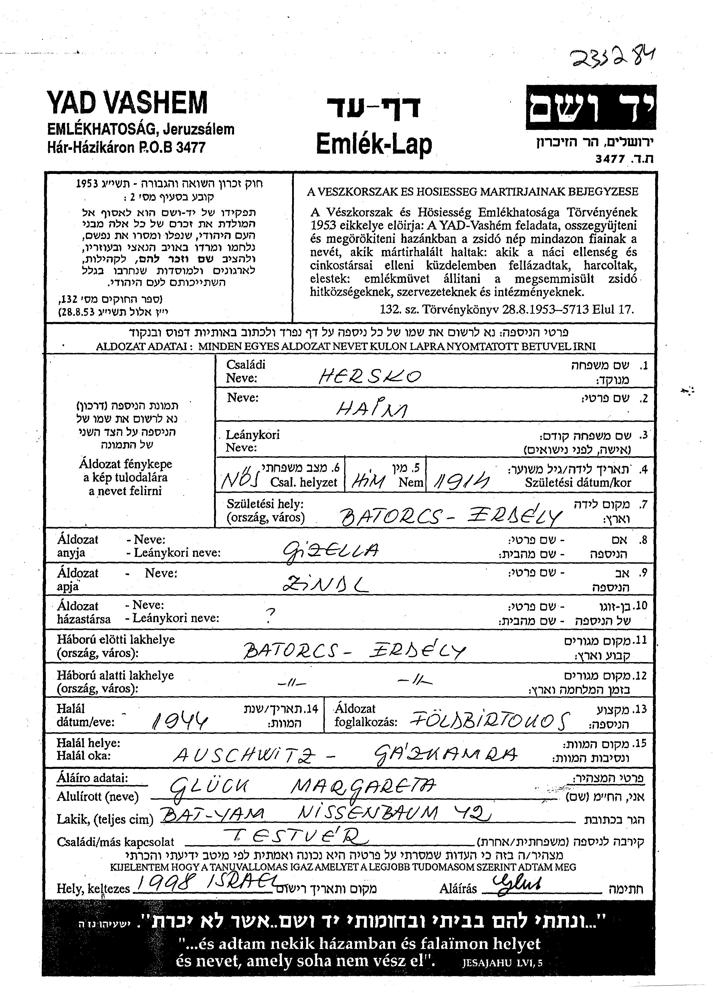 Haim Hersko wurde im Jahr 1914 in Batarcs, Rumänien geboren. Er war der Sohn von Zindl und Gizella, geb. Katz. Vor dem Zweiten Weltkrieg lebte er in Batarcs, Rumänien. Während des Krieges war er in Batarcs, Rumänien.