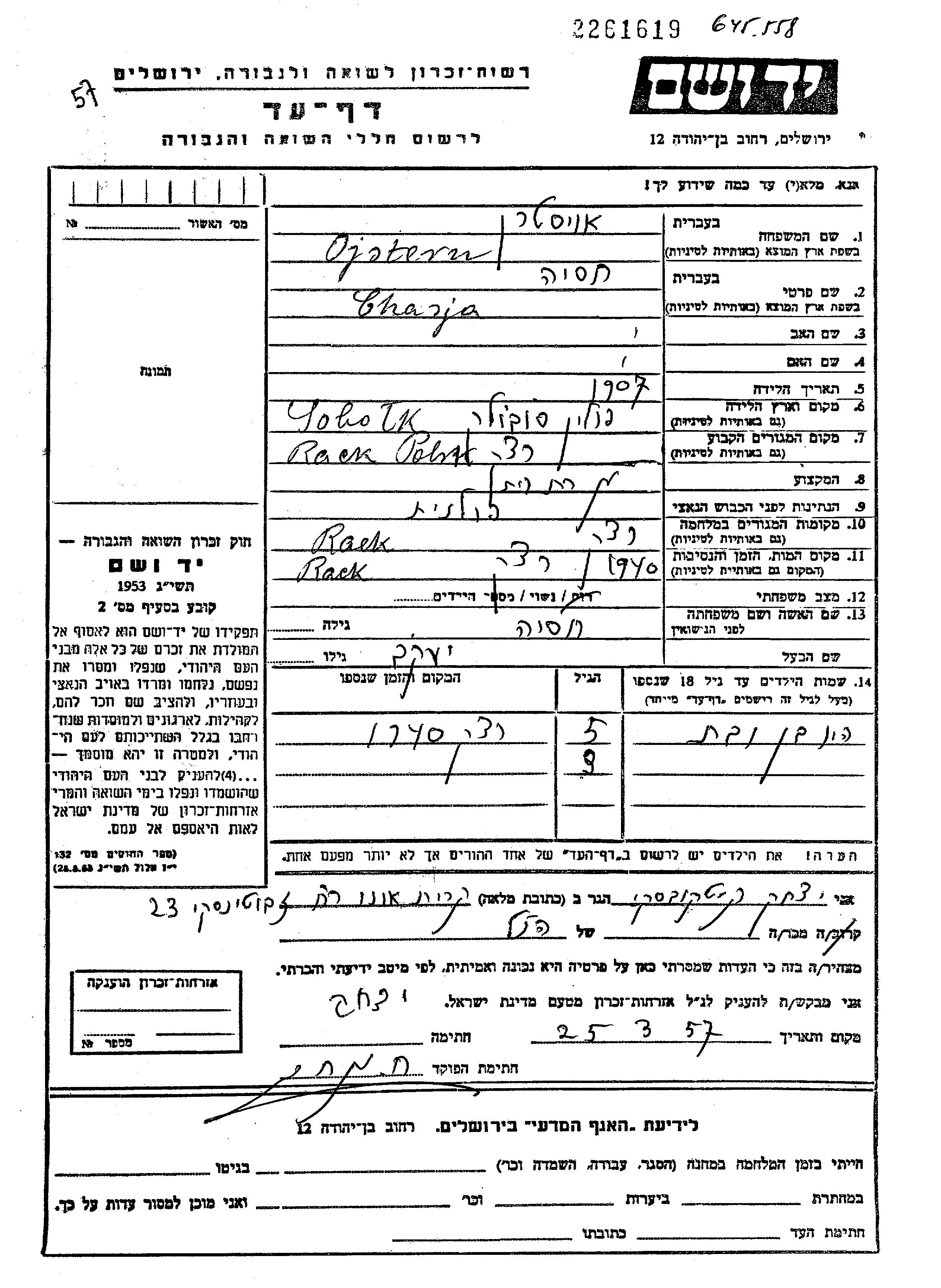 Chasja Khasia Ojstern wurde im Jahr 1907 in Suwalki, Polen geboren. Sie war Hausfrau und mit Jakob Verheiratet. Vor dem Zweiten Weltkrieg lebte sie in Raczki, Polen. Während des Krieges war sie in Raczki, Polen.