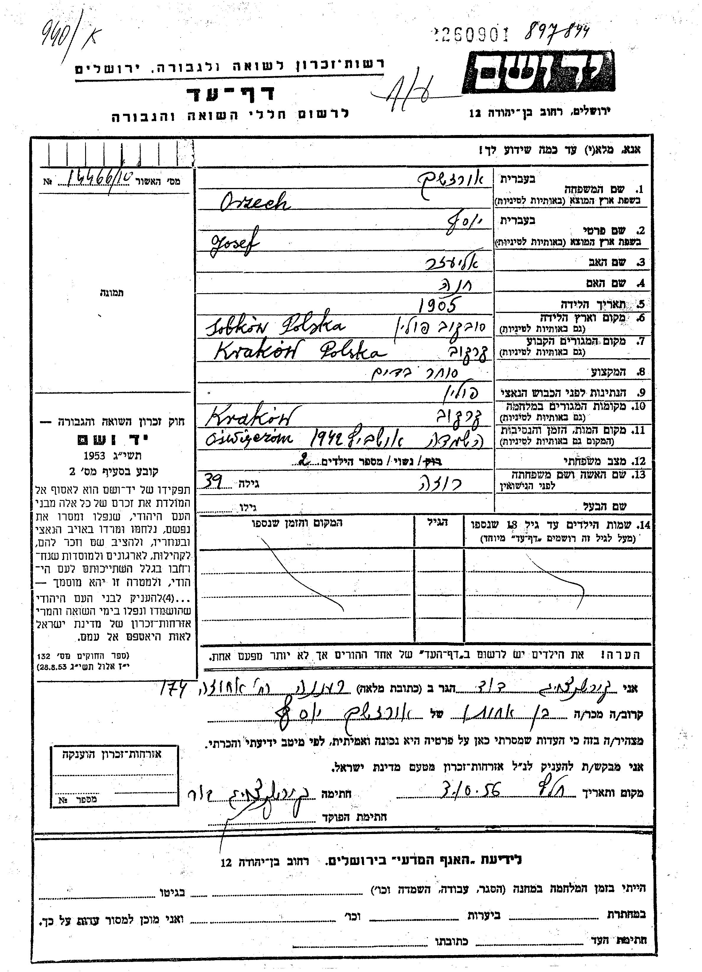 Yosef Orzech wurde im Jahr 1905 in Sobkow, Polen geboren. Er war der Sohn von Eliezer und Khana. Er war Kaufmann/-frau und mit Rosa Verheiratet. Vor dem Zweiten Weltkrieg lebte er in Krakow, Polen. Während des Krieges war er in Krakow, Polen.