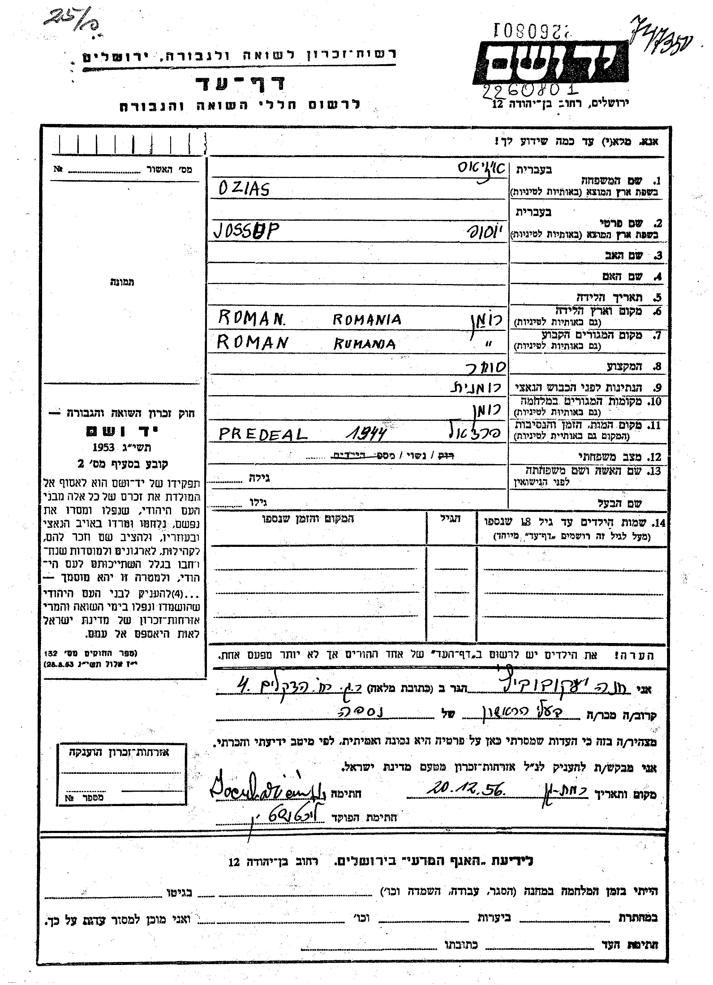 Jossup Ozias wurde in Rumänien geboren. Er war Kaufmann/-frau und mit Khana Verheiratet. Vor dem Zweiten Weltkrieg lebte er in Rumänien. Während des Krieges war er in Rumänien.