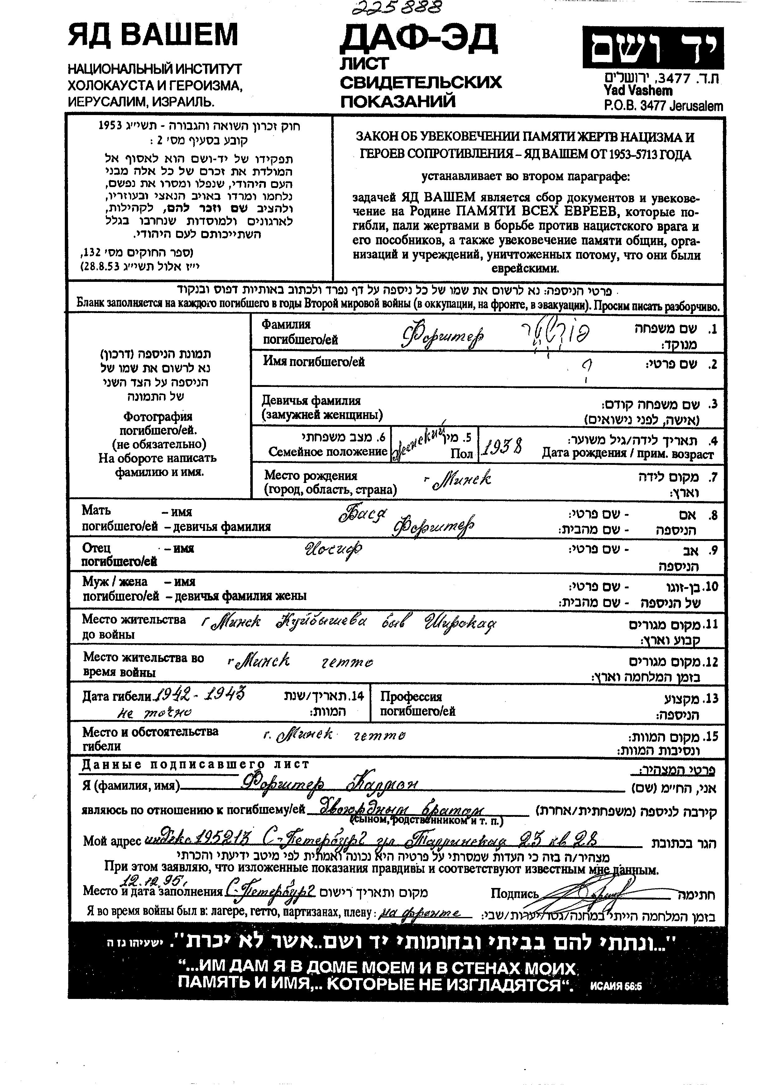 Vorname unbekannt Forshter wurde im Jahr 1938 in Minsk, Weißrussland (UdSSR) geboren. Sie war die Tochter von Iosif und Basya. Sie war Kind. Vor dem Zweiten Weltkrieg lebte sie in Minsk, Weißrussland (UdSSR). Während des Krieges war sie in Minsk, Weißrussland (UdSSR).