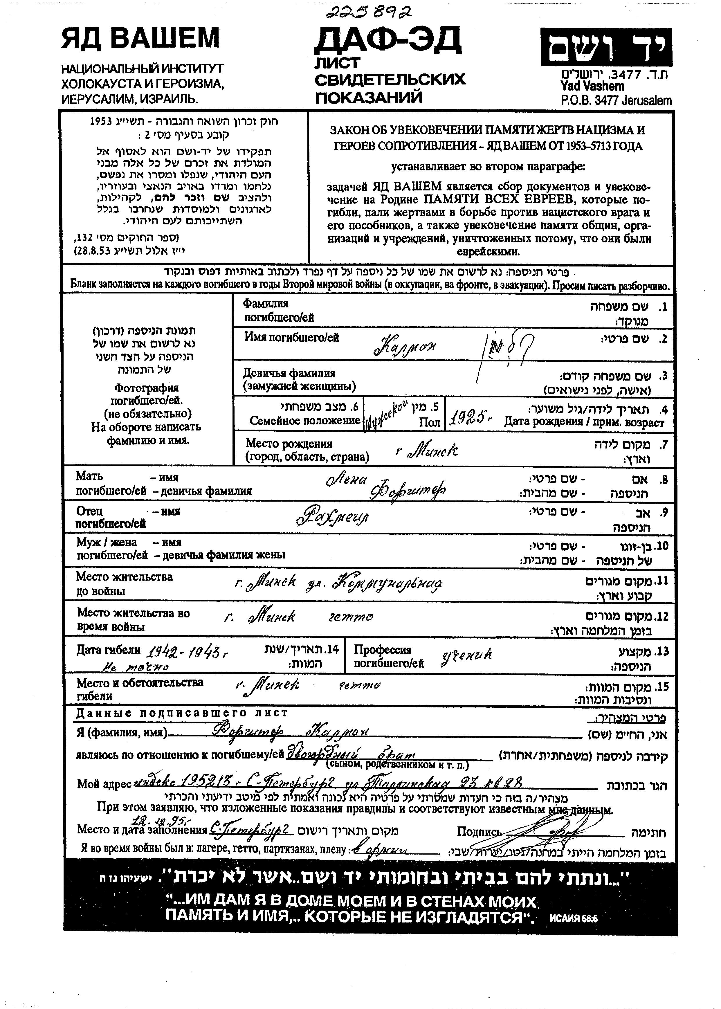 Clemon Kalman Name unbekannt wurde im Jahr 1925 in Minsk, Weißrussland (UdSSR) geboren. Er war der Sohn von Rakhmeil und Lena, geb. Forshter. Er war Schüler/-in und Kind. Vor dem Zweiten Weltkrieg lebte er in Minsk, Weißrussland (UdSSR). Während des Krieges war er in Minsk, Weißrussland (UdSSR).