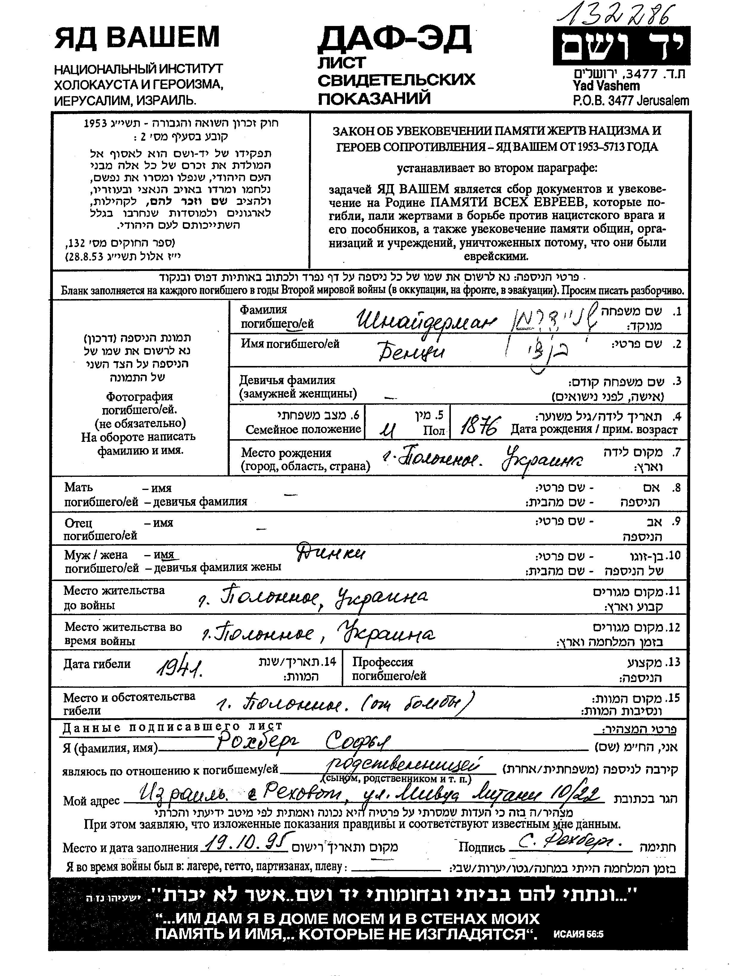Bentzi Shnaiderman wurde im Jahr 1876 in Polonnoye, Ukraine (UdSSR) geboren. Er war mit Dinki Verheiratet. Vor dem Zweiten Weltkrieg lebte er in Polonnoye, Ukraine (UdSSR). Während des Krieges war er in Polonnoye, Ukraine (UdSSR).