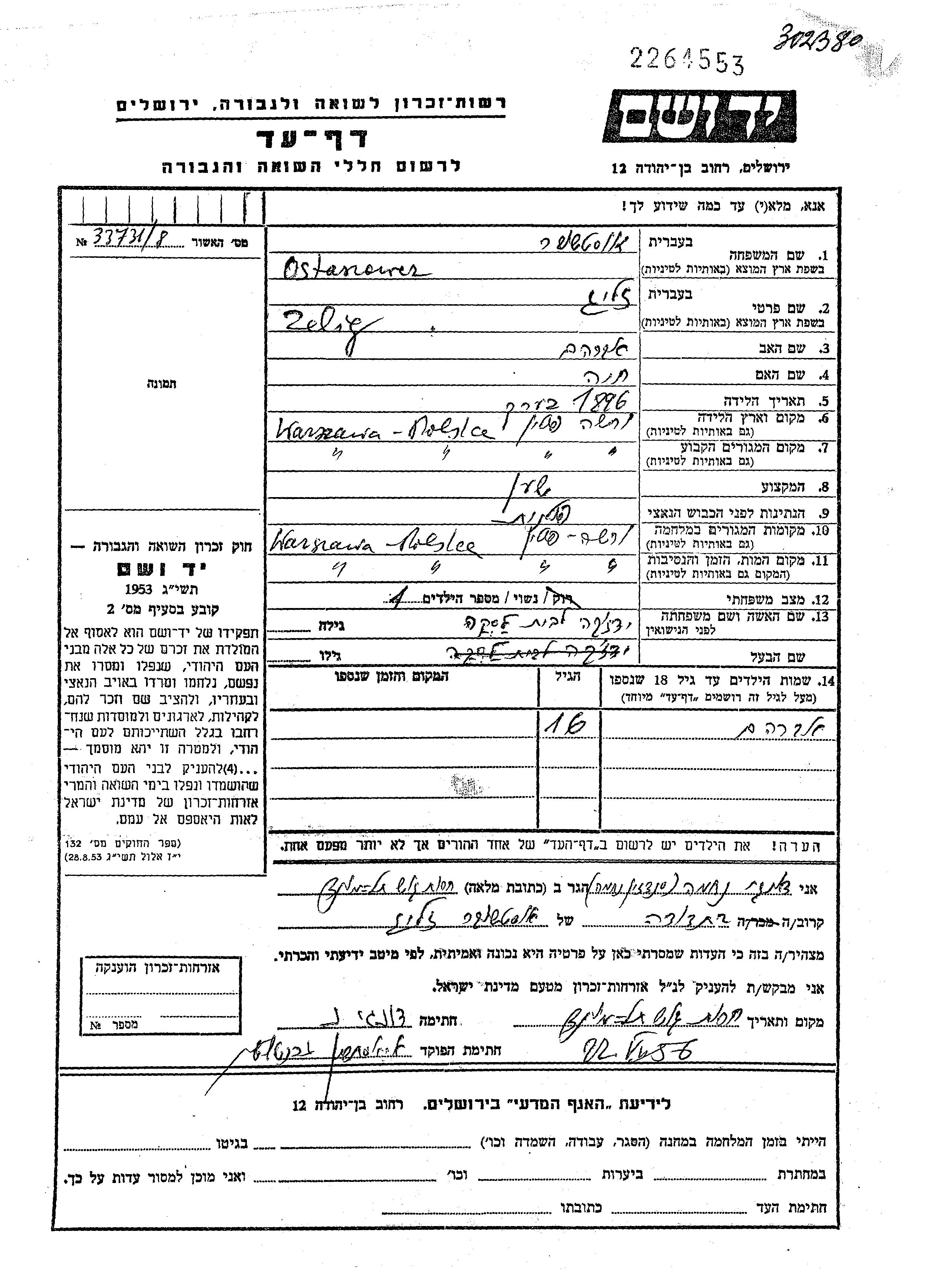Zelig Ostaszower wurde im Jahr 1896 in Warszawa, Polen geboren. Er war der Sohn von Abraham und Khaia. Er war Uhrmacher/-in und mit Yadviga Verheiratet. Vor dem Zweiten Weltkrieg lebte er in Warszawa, Polen. Während des Krieges war er in Warszawa, Polen.