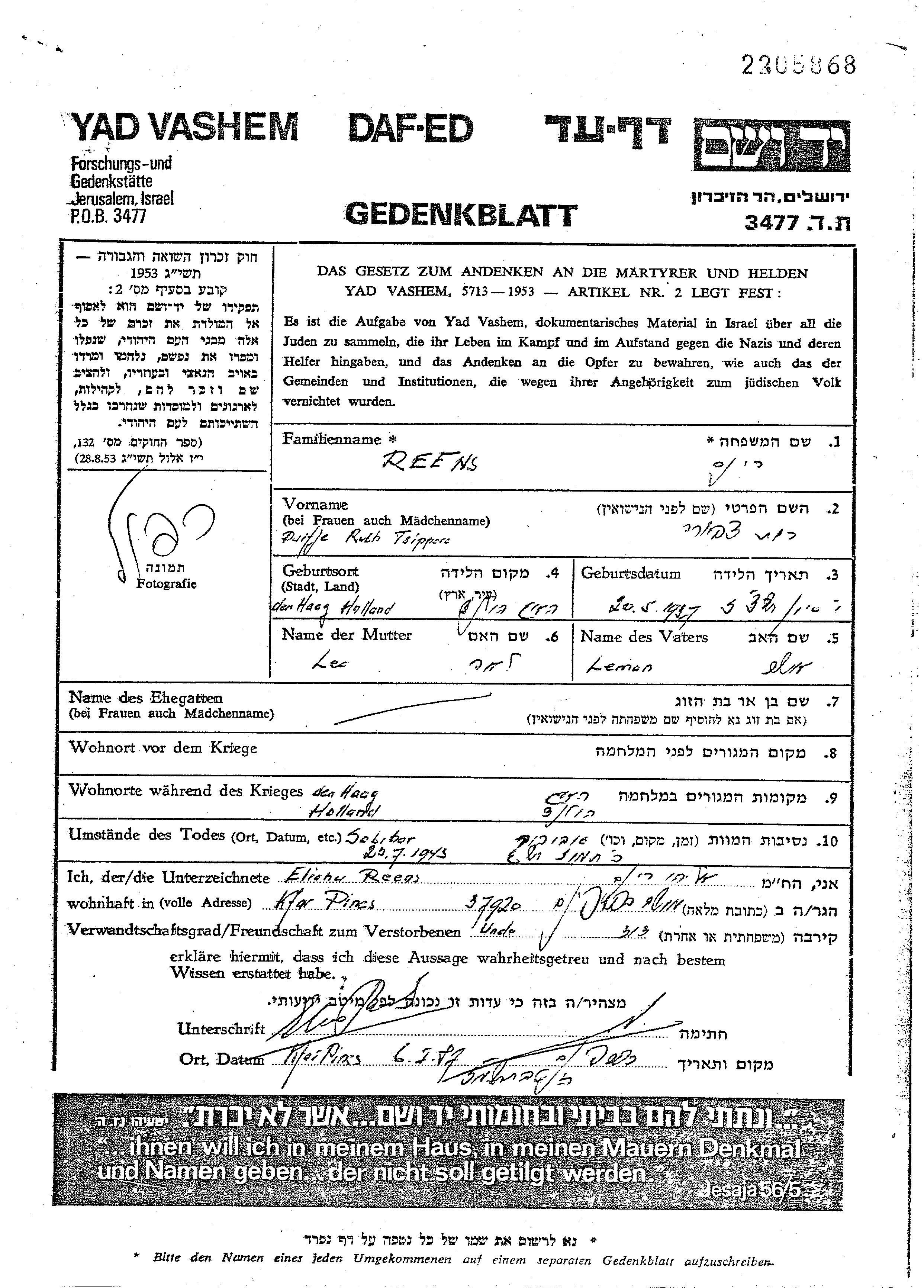 Ruth Tsippora Reines Reens wurde im Jahr 1927 in Den Haag, Niederlande geboren. Sie war die Tochter von Leman Asher und Lea. Während des Krieges war sie in Den Haag, Niederlande.