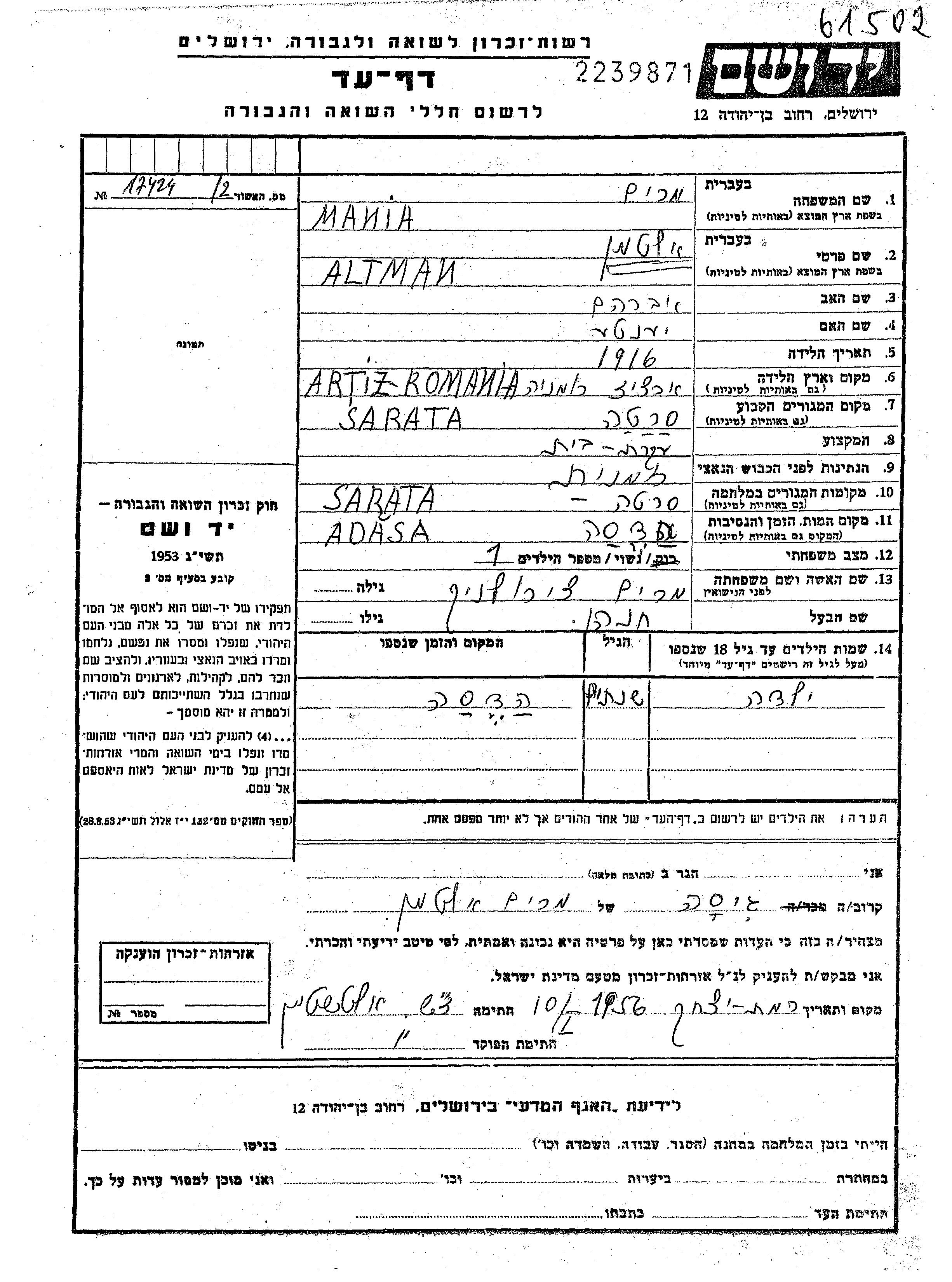 Miriam Mania Altman, geb. Tzirulnik wurde im Jahr 1916 in Arciz, Rumänien geboren. Sie war die Tochter von Avraham und Yente. Sie war Hausfrau und mit Khana Khanan Verheiratet. Vor dem Zweiten Weltkrieg lebte sie in Sarata, Rumänien. Während des Krieges war sie in Sarata, Rumänien.
