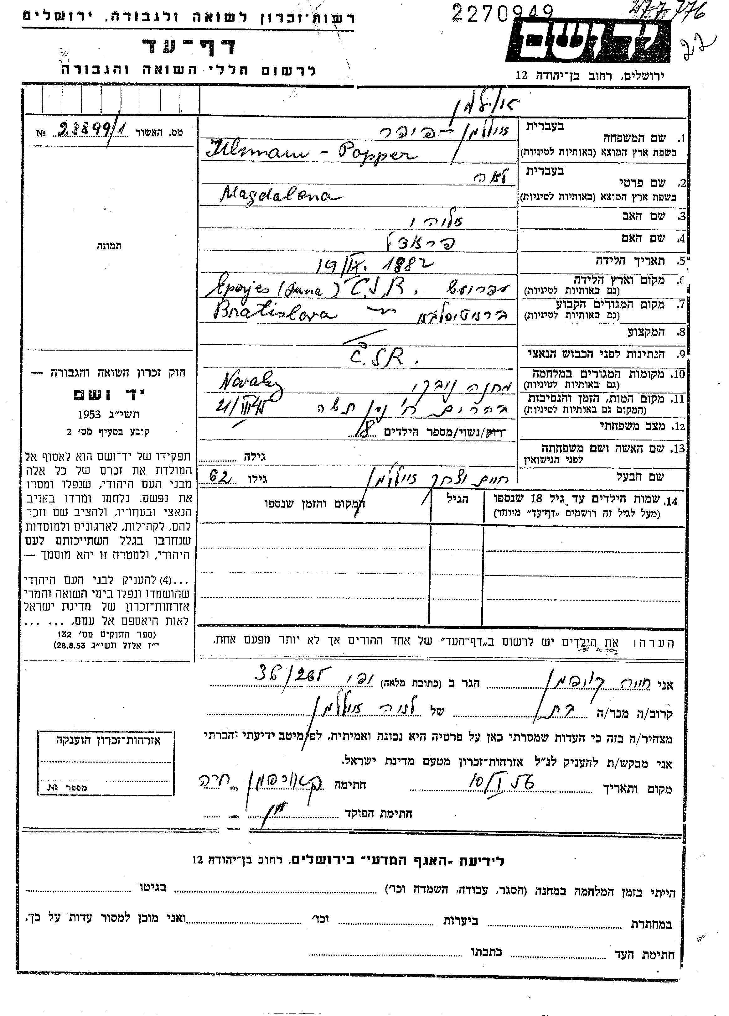 Lea Magdalena Ulmann, geb. Popper wurde im Jahr 1882 in Eperjes, Tschechoslowakei geboren. Sie war die Tochter von Eliahu und Fradel Fradel. Sie war mit Yitzkhak Khaim Verheiratet. Vor dem Zweiten Weltkrieg lebte sie in Bratislava, Tschechoslowakei. Während des Krieges war sie in Novaky, Tschechoslowakei.