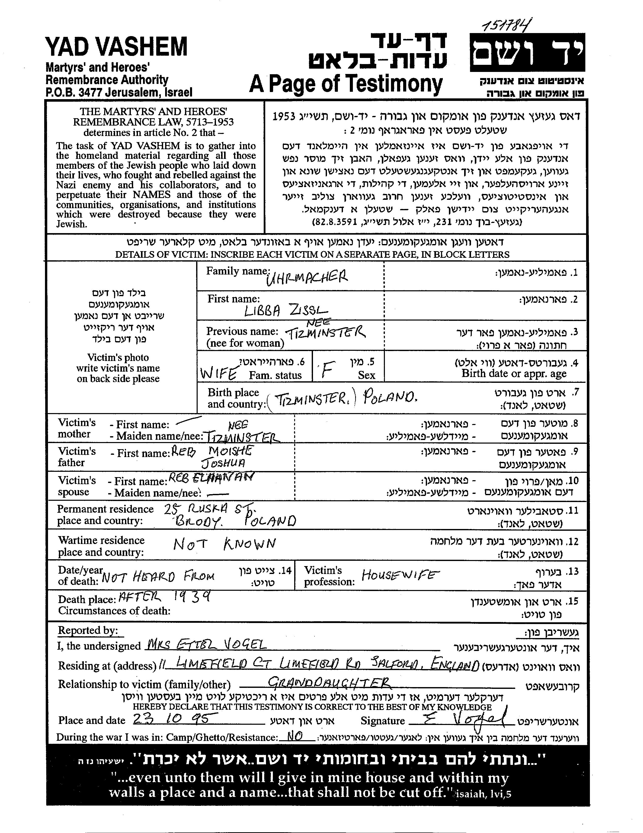 Libba Zissl Uhrmacher, geb. Tizminster wurde in Polen geboren. Sie war die Tochter von Moishe Joshua. Sie war Hausfrau und mit Elhanan Verheiratet. Vor dem Zweiten Weltkrieg lebte sie in Brody, Polen. Während des Krieges war sie in Brody, Polen.