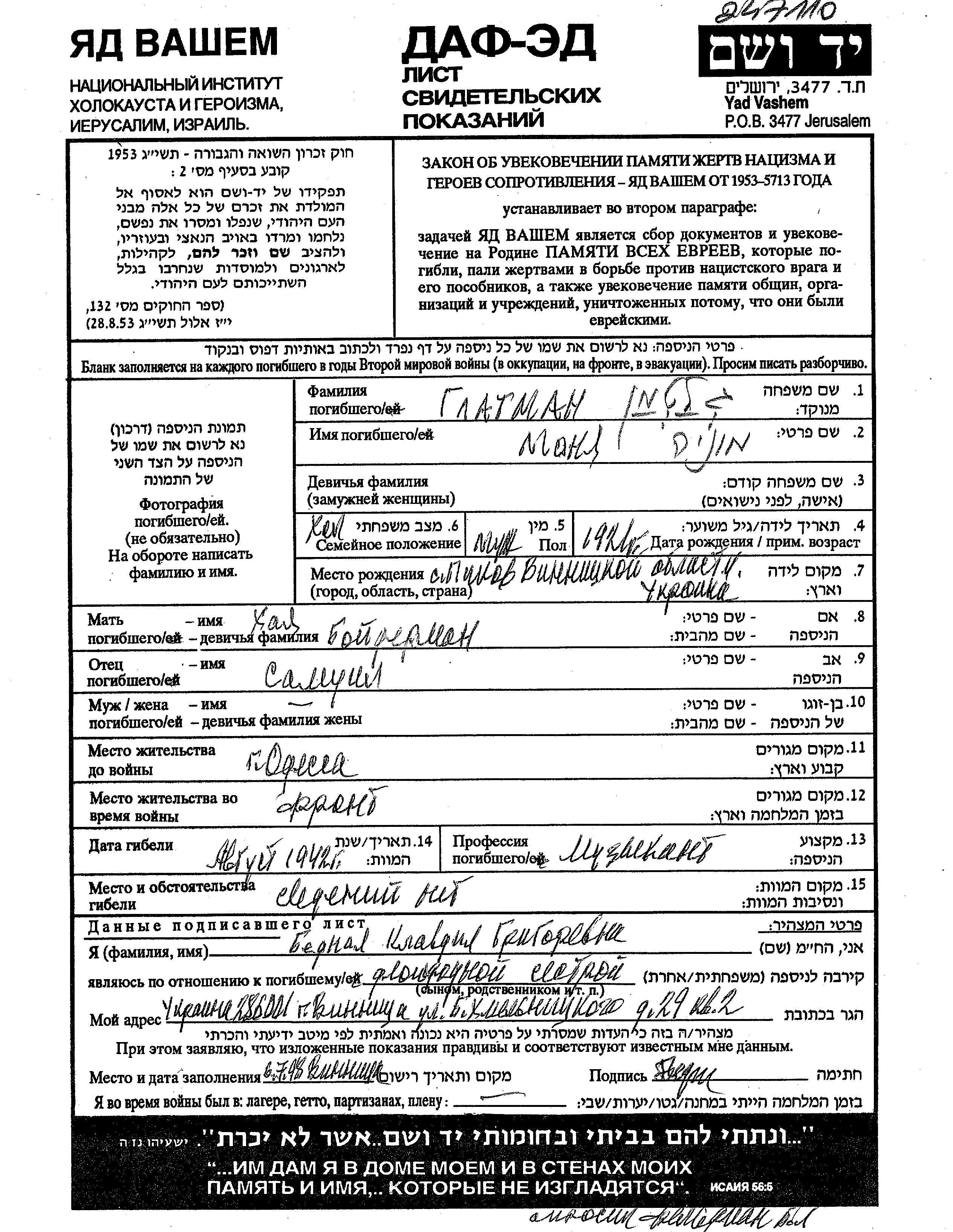 Monya Glatman wurde im Jahr 1921 in Pikov, Ukraine (UdSSR) geboren. Er war der Sohn von Samuil und Khaia, geb. Boiderman. Er war Musiker/-in und Ledig. Vor dem Zweiten Weltkrieg lebte er in Odessa, Ukraine (UdSSR). Während des Krieges war er in die Sowjetischen Streitkräfte. Monya im Militärdienst umgekommen. Todesort: unbekannt im Jahr 1942.