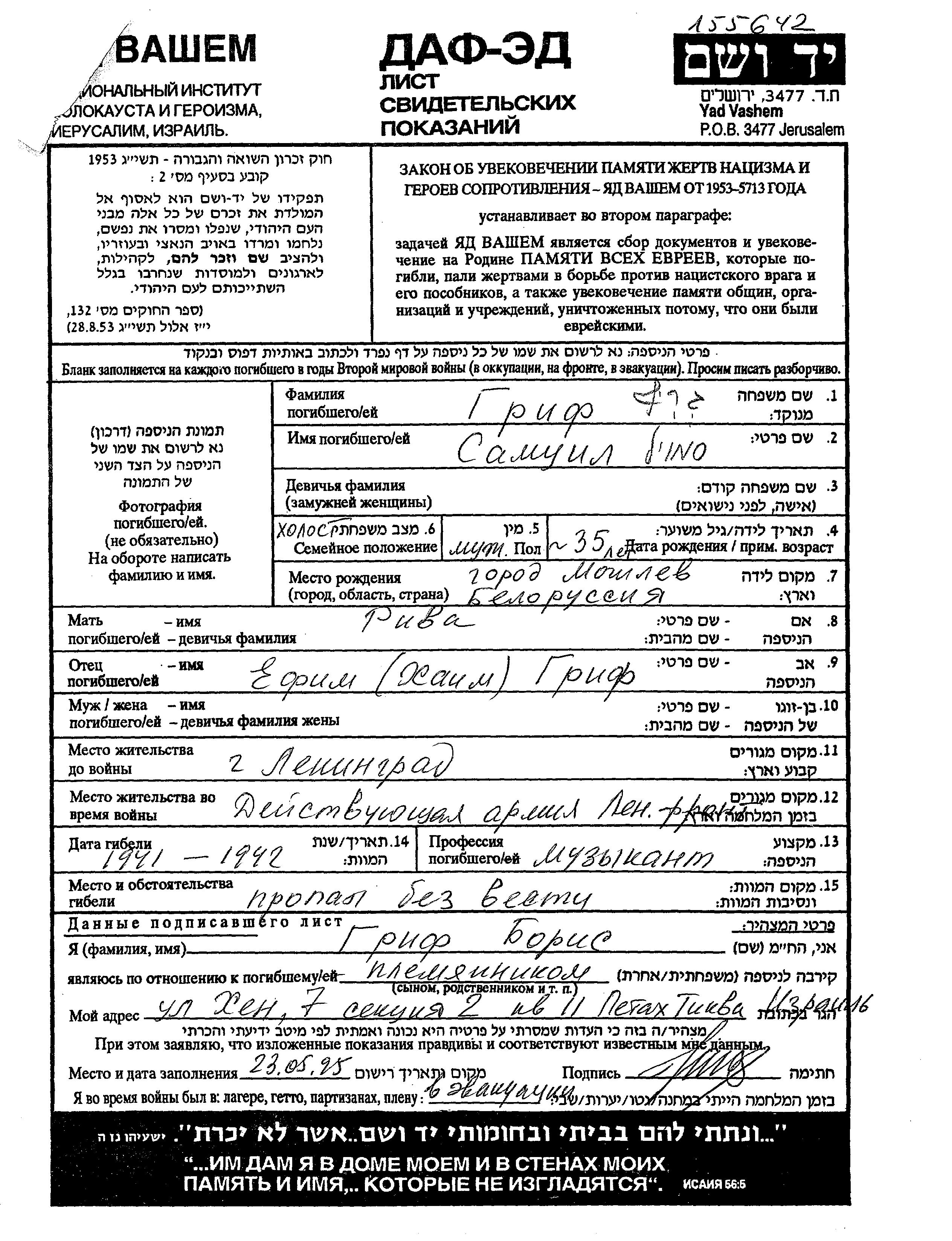 Samuil wurde in der Schoah ermordet. Todesort: unbekannt im Jahr 1942.