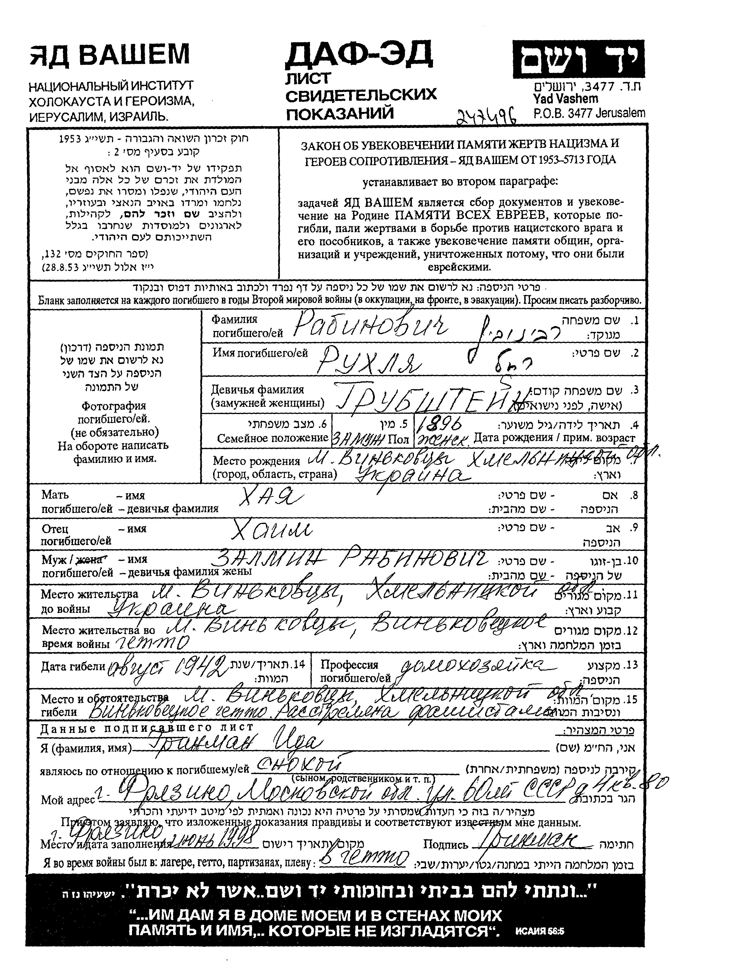 Rukhlya Rabinovich, geb. Grobshtein wurde im Jahr 1896 in Vinkovtsy, Ukraine (UdSSR) geboren. Sie war die Tochter von Khaim und Khaia. Sie war Hausfrau und mit Zalmin Verheiratet. Vor dem Zweiten Weltkrieg lebte sie in Vinkovtsy, Ukraine (UdSSR). Während des Krieges war sie in Vinkovtsy, Ukraine (UdSSR).