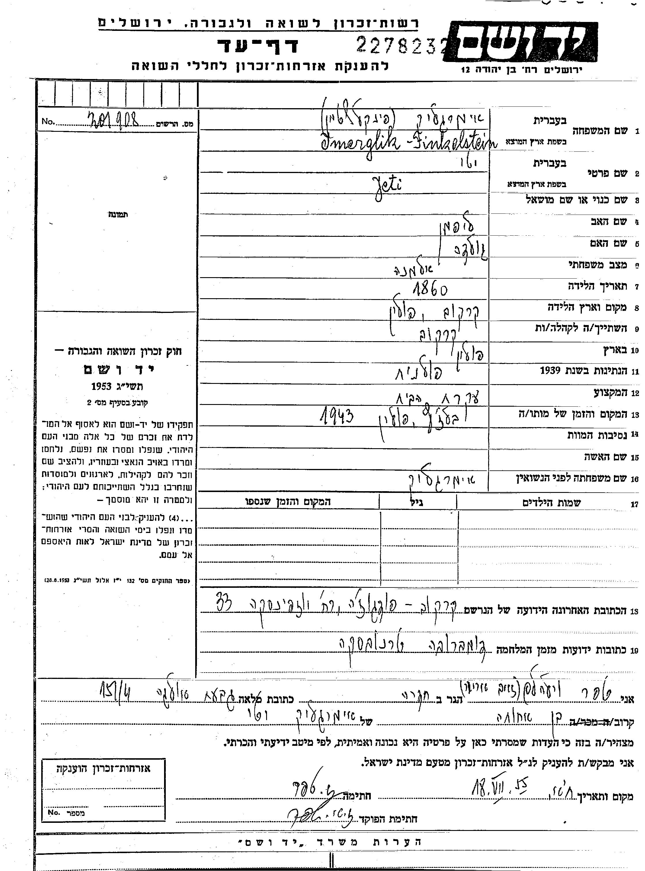 Yeti Finkelshtein, geb. Imerglik wurde im Jahr 1860 in Krakow, Polen geboren. Sie war die Tochter von Lipman und Golda. Sie war Hausfrau und Verwitwet. Vor dem Zweiten Weltkrieg lebte sie in Krakow, Polen. Während des Krieges war sie in Dabrowa Tarnowska, Polen.