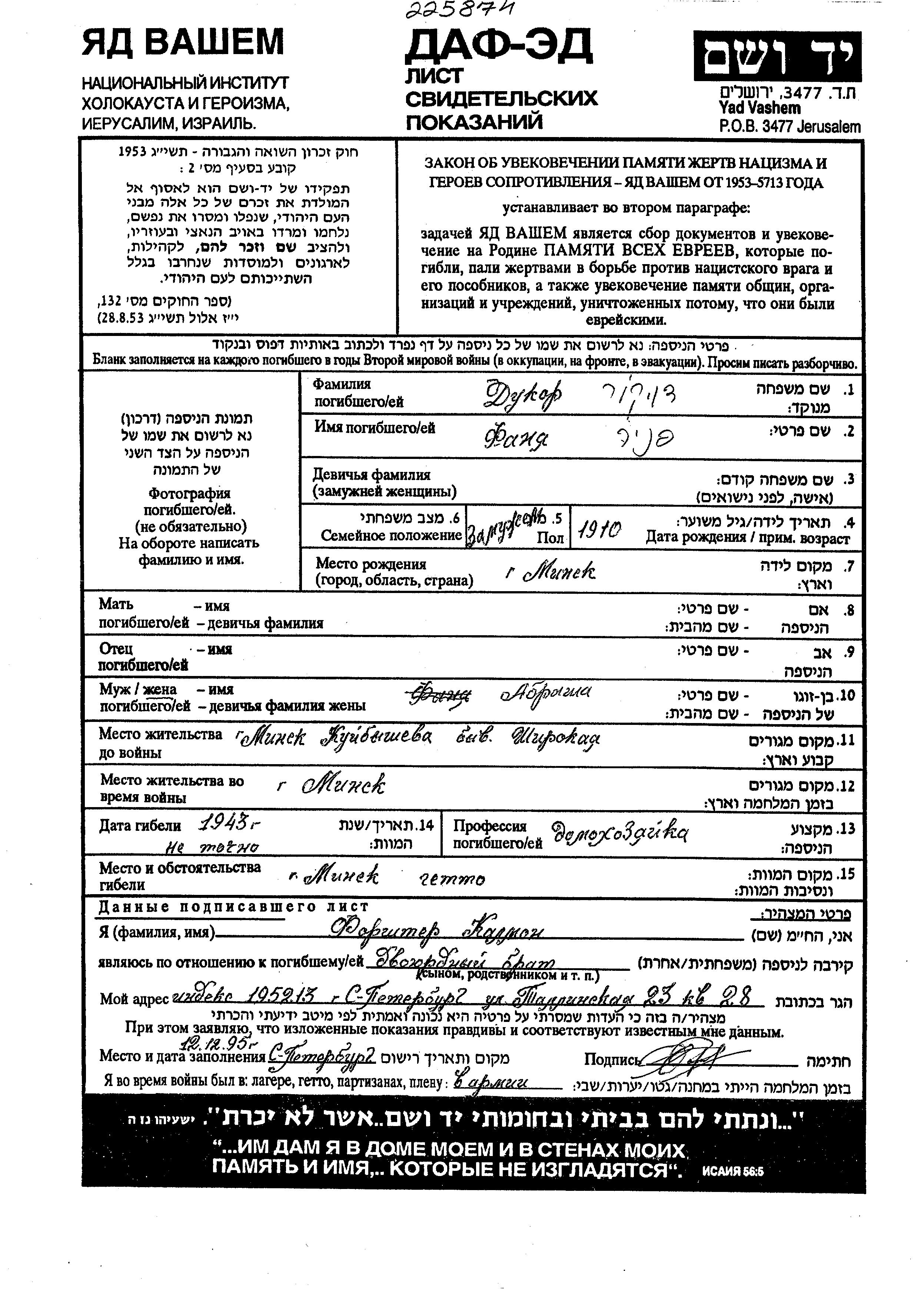 Tanya Dukor wurde im Jahr 1910 in Minsk, Weißrussland (UdSSR) geboren. Sie war Hausfrau und Verheiratet. Vor dem Zweiten Weltkrieg lebte sie in Minsk, Weißrussland (UdSSR). Während des Krieges war sie in Minsk, Weißrussland (UdSSR).