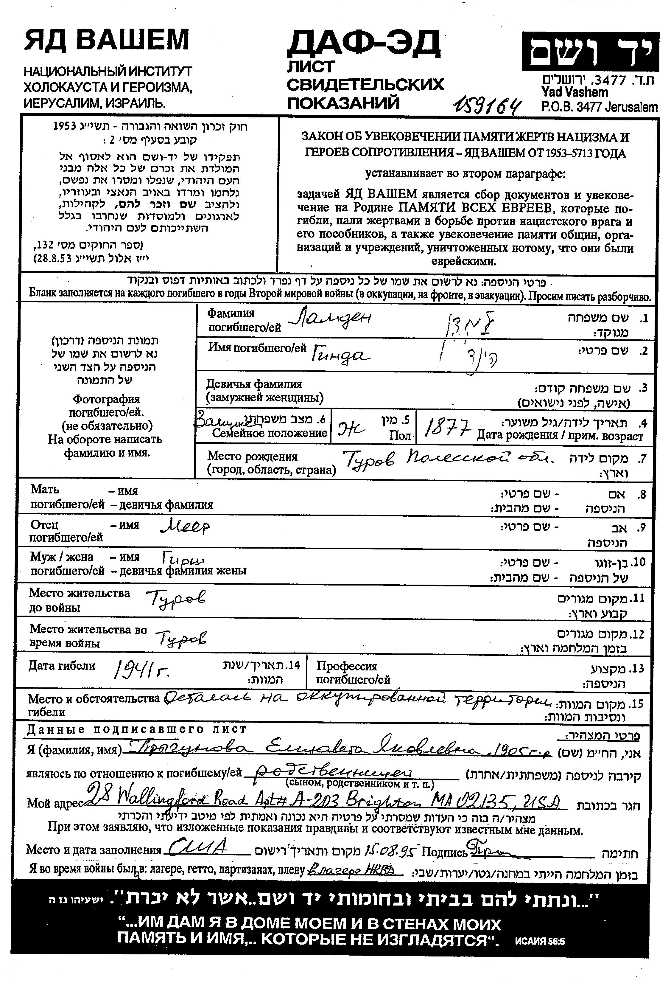 Ginda Lamden Lamdan wurde im Jahr 1877 in Turov, Weißrussland (UdSSR) geboren. Sie war die Tochter von Meyer. Sie war mit Hirsh Verheiratet. Vor dem Zweiten Weltkrieg lebte sie in Turov, Weißrussland (UdSSR). Während des Krieges war sie in Turov, Weißrussland (UdSSR).