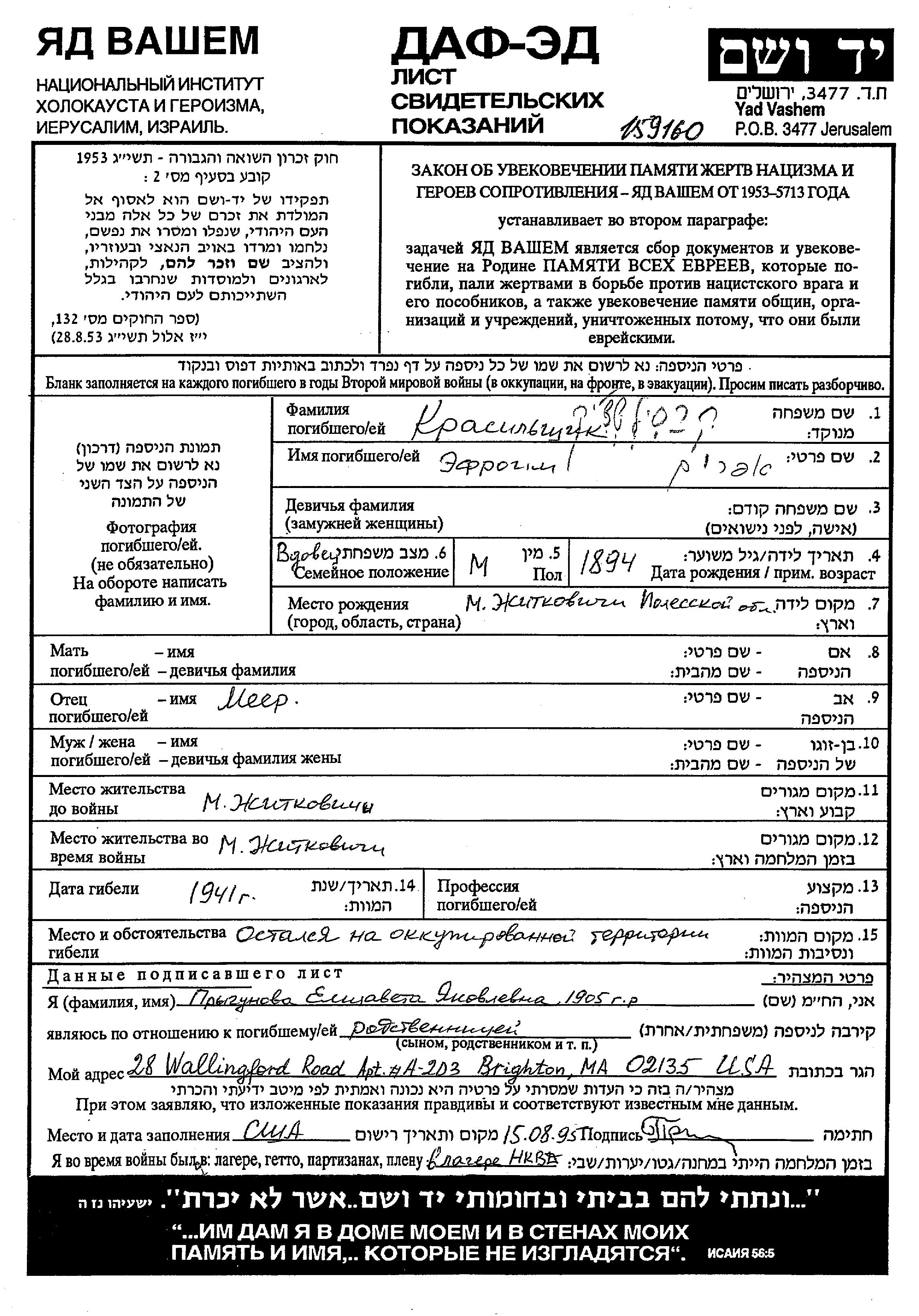 Efroim Krasilshchik wurde im Jahr 1894 in Zhitkovichi, Weißrussland (UdSSR) geboren. Er war der Sohn von Meyer. Er war Verwitwet. Vor dem Zweiten Weltkrieg lebte er in Zhitkovichi, Weißrussland (UdSSR). Während des Krieges war er in Zhitkovichi, Weißrussland (UdSSR).