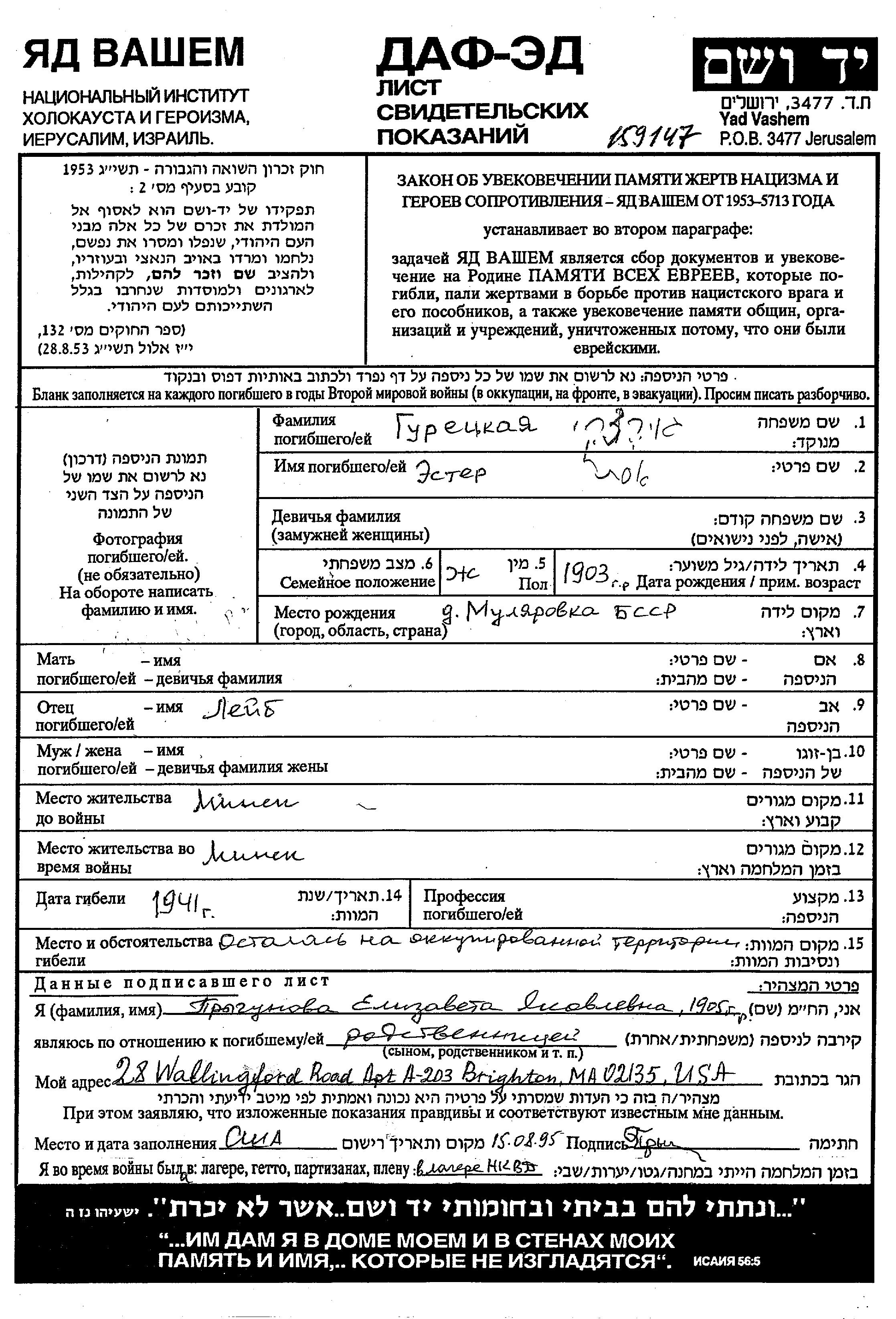 Ester Guretzki wurde im Jahr 1903 in Mulyarovka, Weißrussland (UdSSR) geboren. Sie war die Tochter von Leib. Vor dem Zweiten Weltkrieg lebte sie in Minsk, Weißrussland (UdSSR). Während des Krieges war sie in Minsk, Weißrussland (UdSSR).