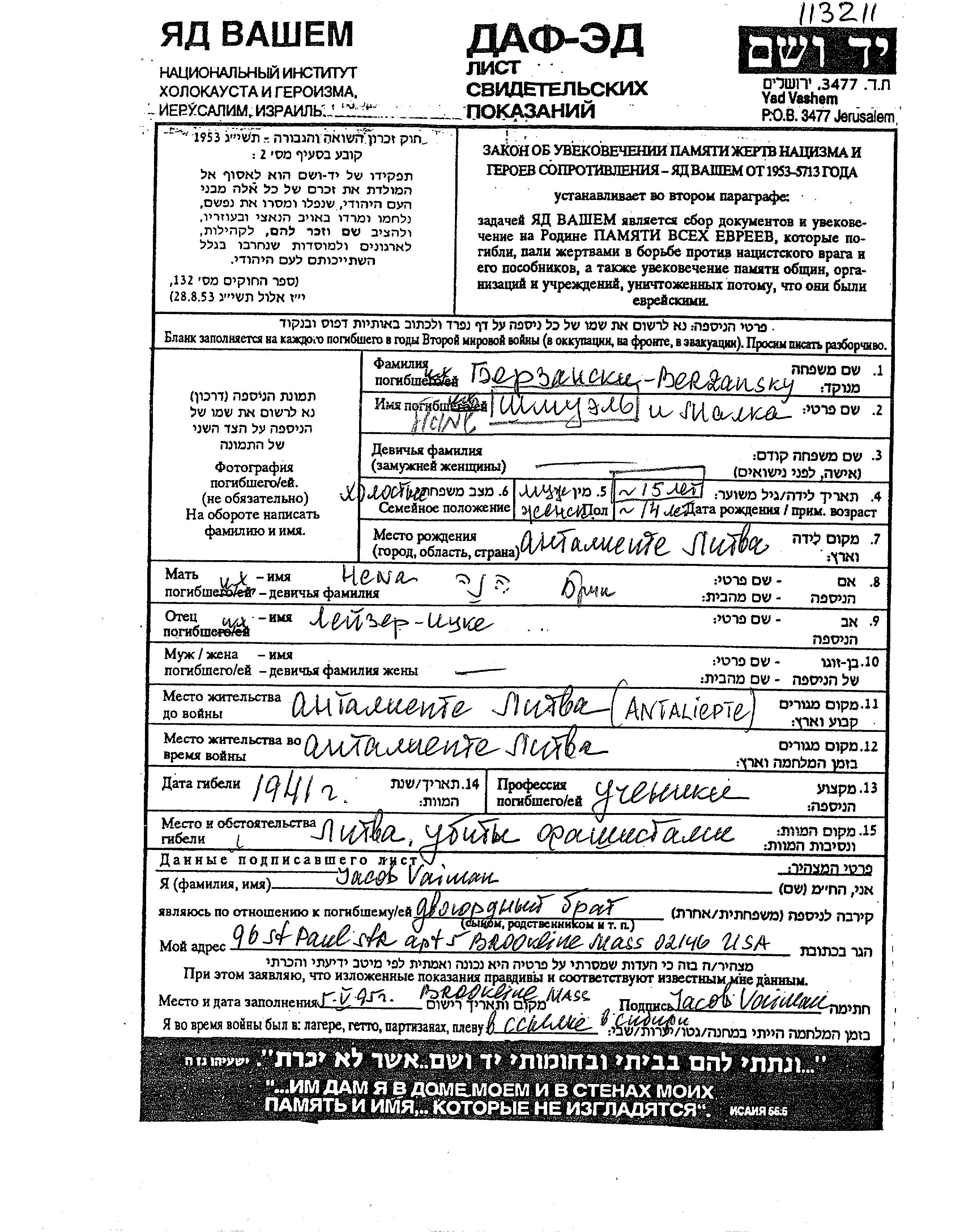 Shmuel Berzanski wurde im Jahr 1926 in Antaliepte, Litauen geboren. Er war der Sohn von Itzke Leizer und Khiena, geb. Brin. Er war Schüler/-in und Kind. Vor dem Zweiten Weltkrieg lebte er in Antaliepte, Litauen. Während des Krieges war er in Antaliepte, Litauen.