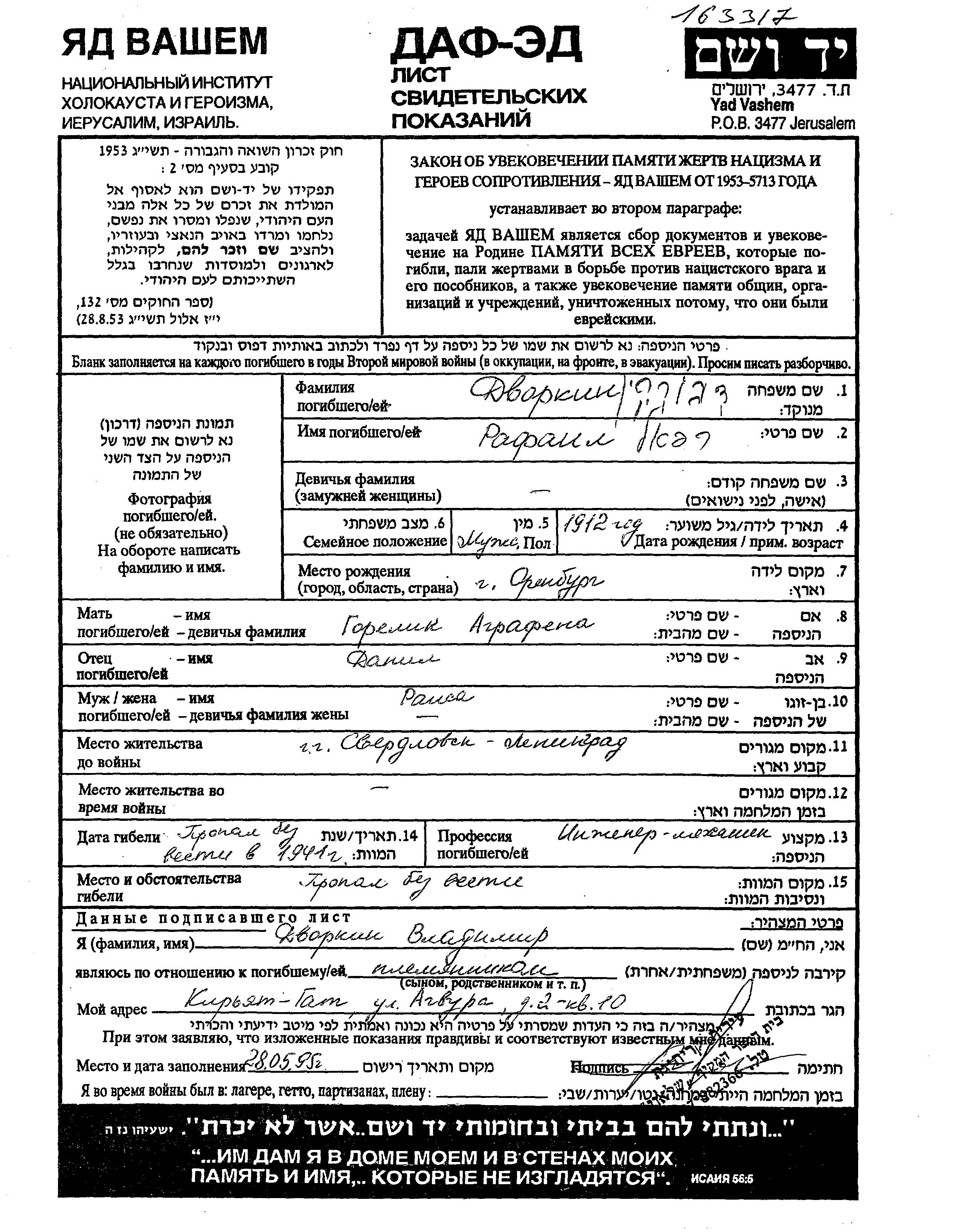 Rafael Dvorkin wurde im Jahr 1912 in Orenburg, Russland (UdSSR) geboren. Er war der Sohn von Daniel und Agrafena, geb. Gorelik. Er war Ingenieur und mit Raisa Verheiratet. Vor dem Zweiten Weltkrieg lebte er in Leningrad, Russland (UdSSR). Während des Krieges war er in die Sowjetischen Streitkräfte.
