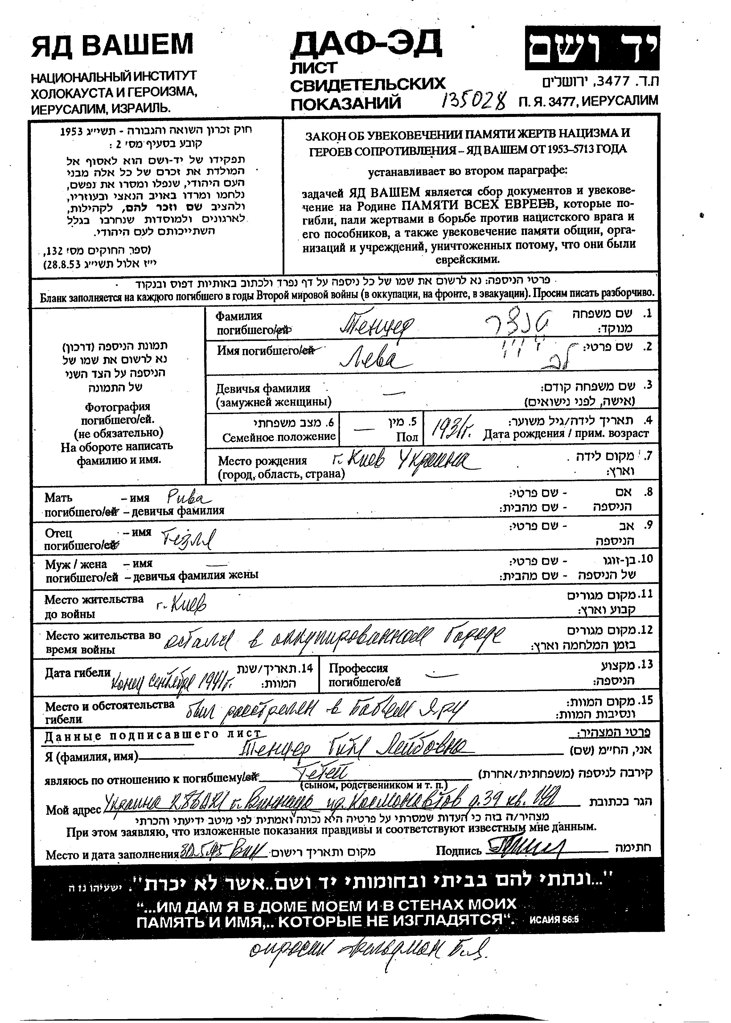 Liuba wurde in der Schoah ermordet. Todesort: Babi Yar, Ukraine (UdSSR) im Jahr 1941.