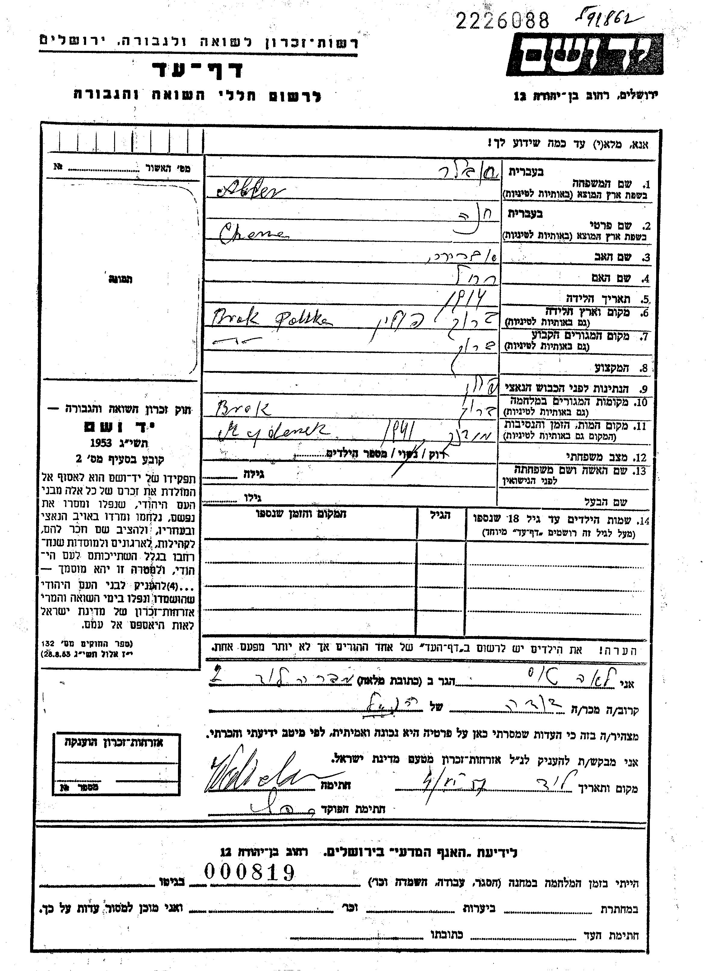 Chana Abler wurde im Jahr 1914 in Brok, Polen geboren. Sie war die Tochter von Abram und Rachel. Sie war Ledig. Vor dem Zweiten Weltkrieg lebte sie in Brok, Polen. Während des Krieges war sie in Brok, Polen.