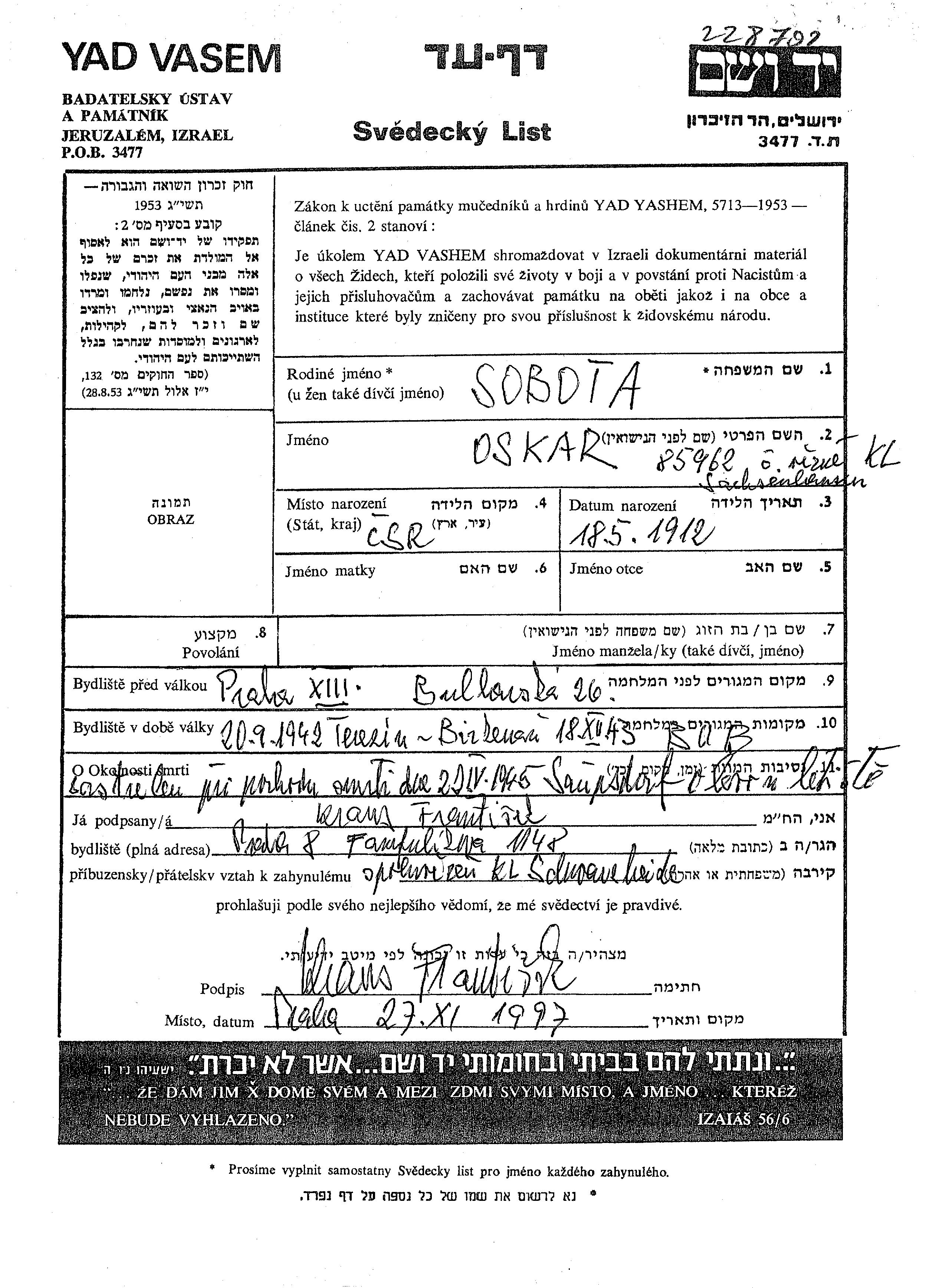Oskar Sobota wurde im Jahr 1912 in Tschechoslowakei geboren. Vor dem Zweiten Weltkrieg lebte er in Praha, Tschechoslowakei. Während des Krieges war er in Birkenau, Polen.