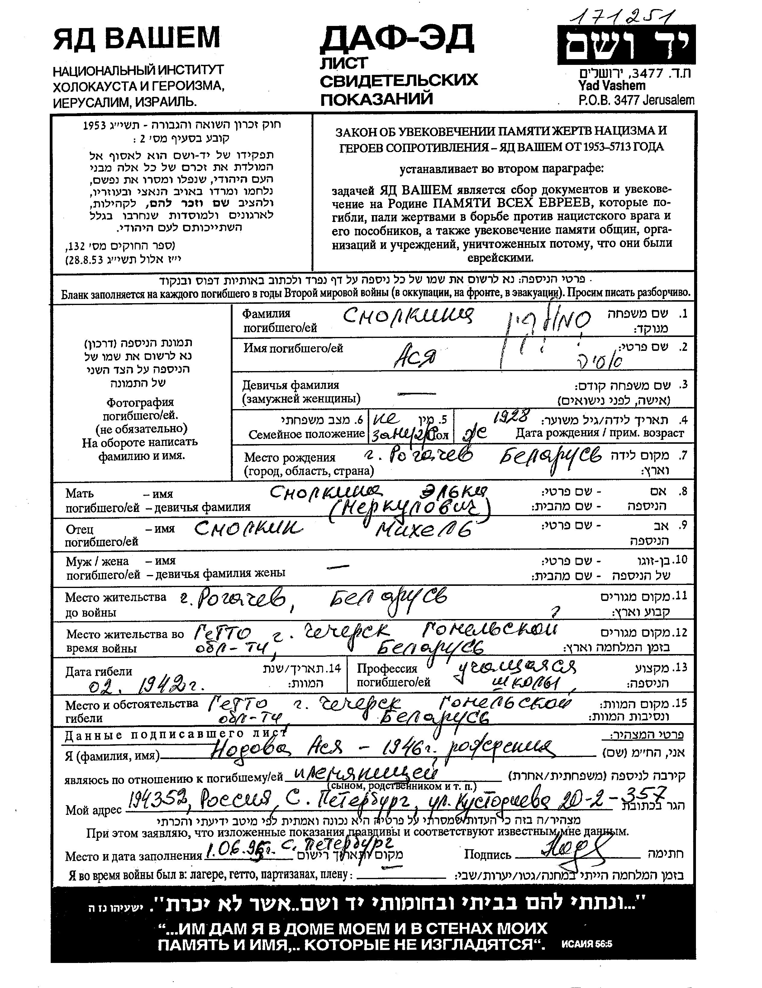 Asya wurde in der Schoah ermordet. Todesort: Chechersk, Weißrussland (UdSSR) im Jahr 1942.