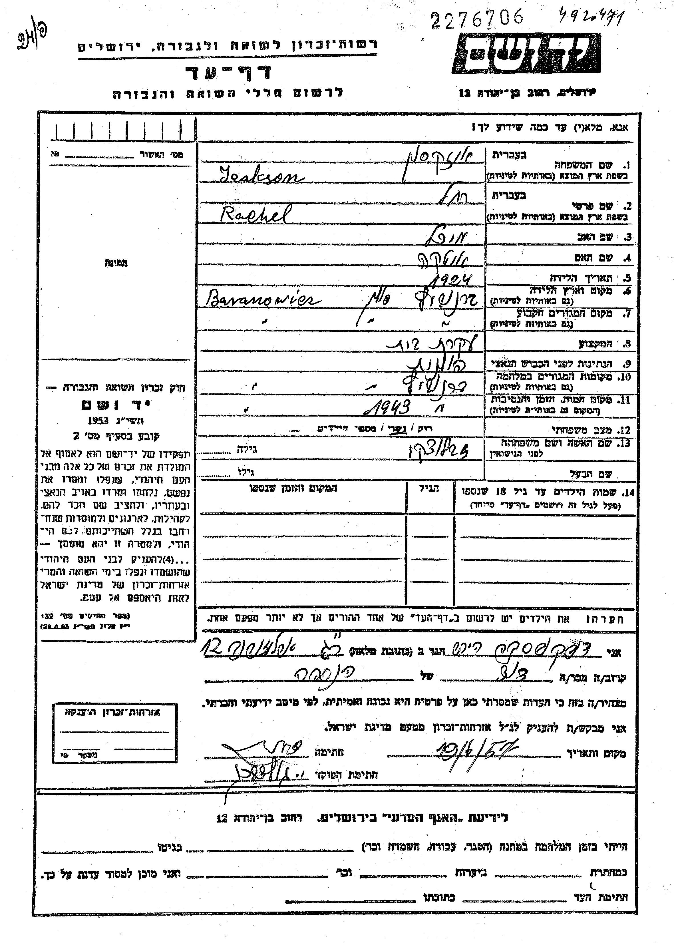 Izakson Rachel 1924 Baranowicze, Polen Gedenkblatt