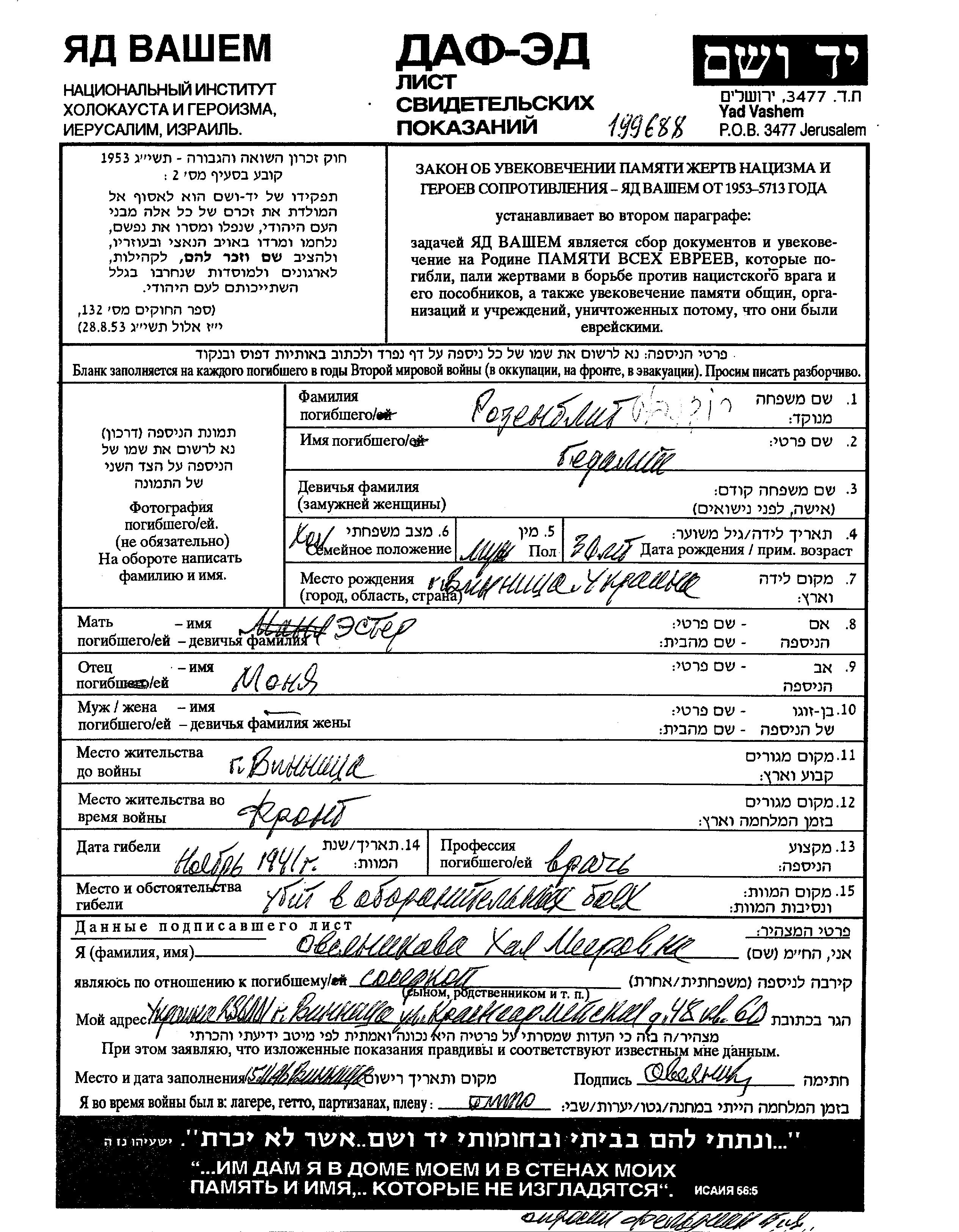 Gedalia Rozenblit wurde im Jahr 1911 in Vinnitsa, Ukraine (UdSSR) geboren. Er war der Sohn von Monya und Ester. Er war Arzt/ärztin und Ledig. Vor dem Zweiten Weltkrieg lebte er in Vinnitsa, Ukraine (UdSSR). Während des Krieges war er in die Sowjetischen Streitkräfte. Gedalia im Militärdienst umgekommen. Todesort: unbekannt im Jahr 1941.