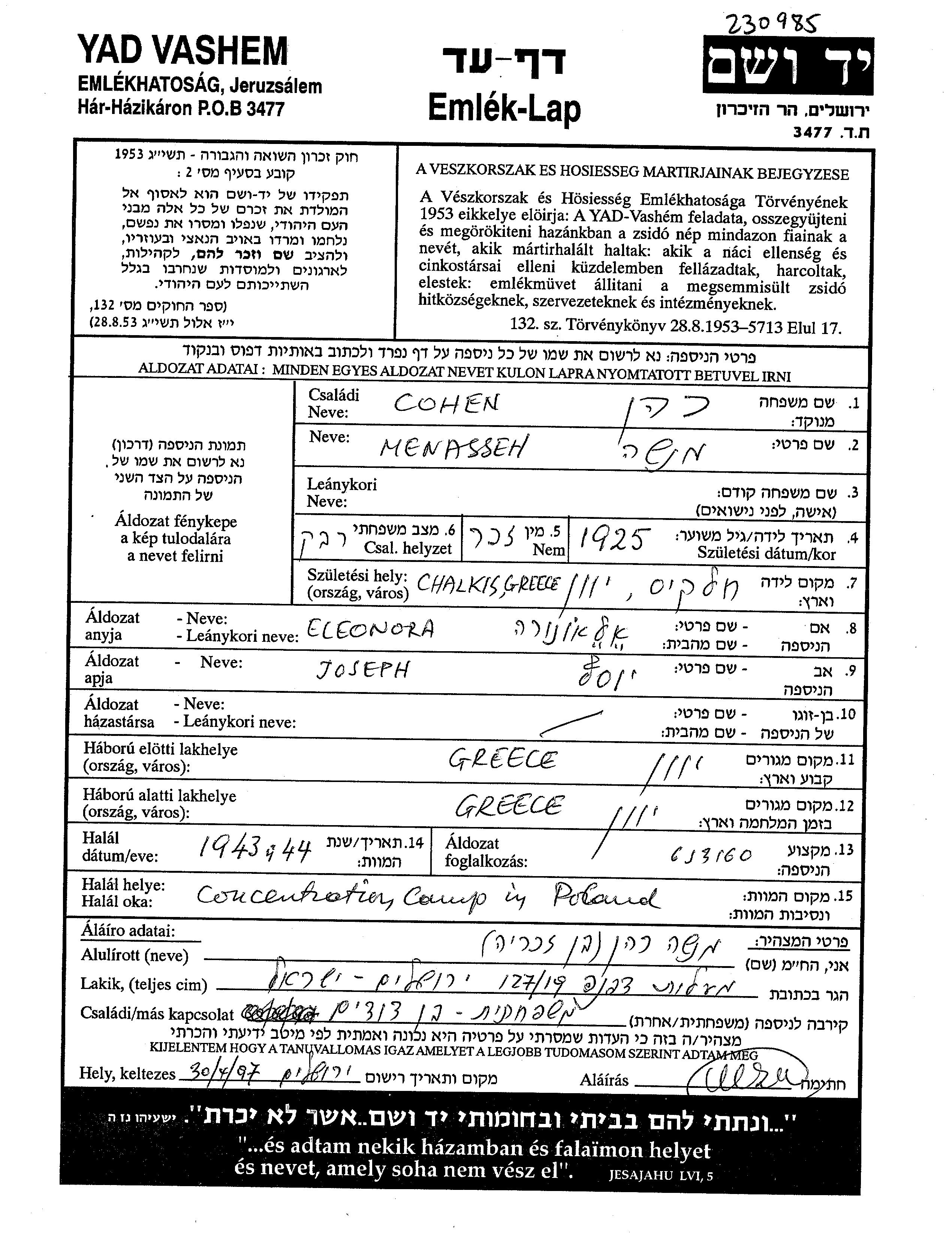 Menasseh Cohen wurde im Jahr 1925 in Khalkis, Griechenland geboren. Er war der Sohn von Joseph und Eleonora. Er war Schüler/-in. Vor dem Zweiten Weltkrieg lebte er in Griechenland. Während des Krieges war er in Griechenland.