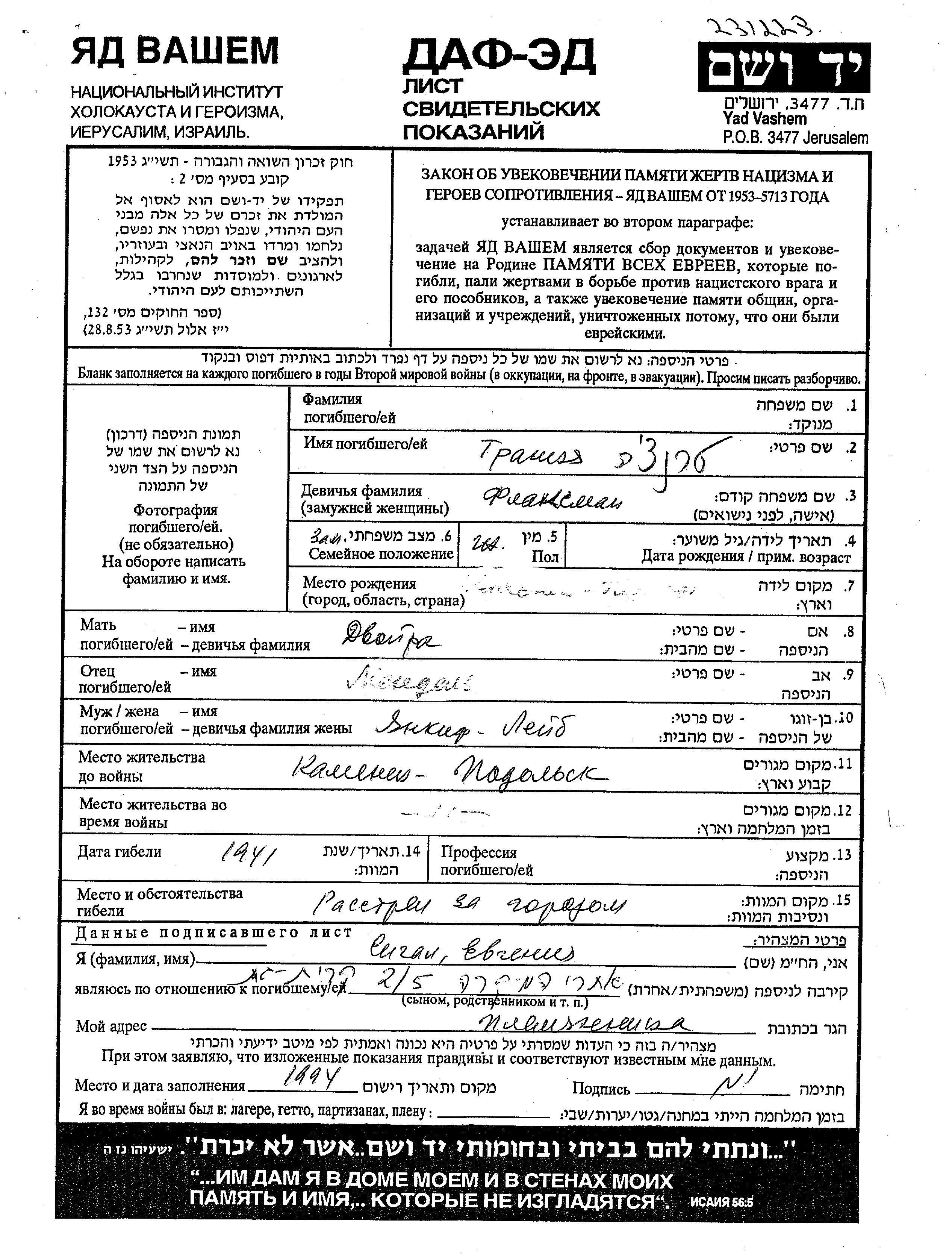 Trantzya wurde in der Schoah ermordet. Todesort: Kamenets Podolskiy, Ukraine (UdSSR) im Jahr 1941.