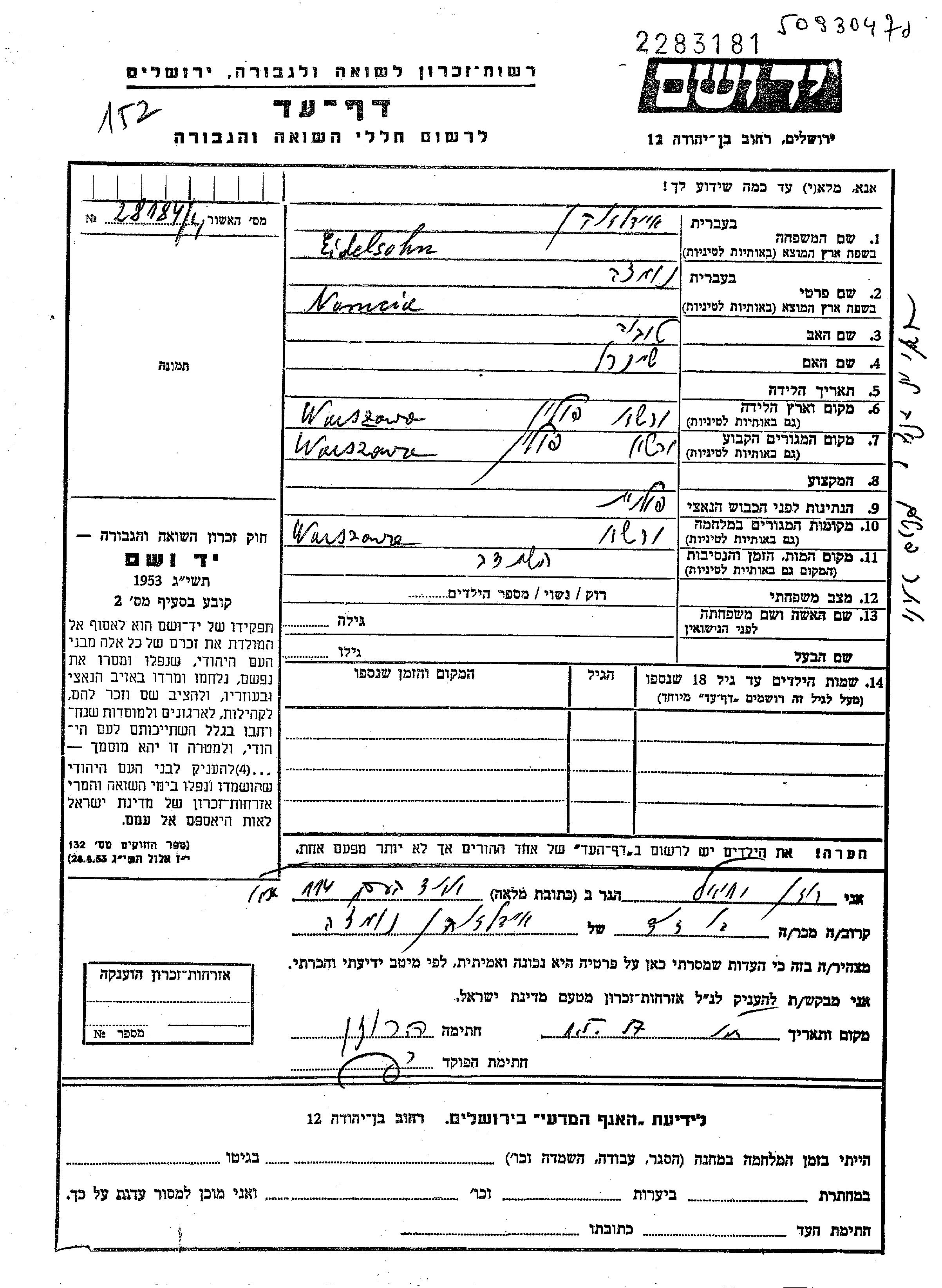 Eidelsohn Nomcia Warszawa, Polen Gedenkblatt