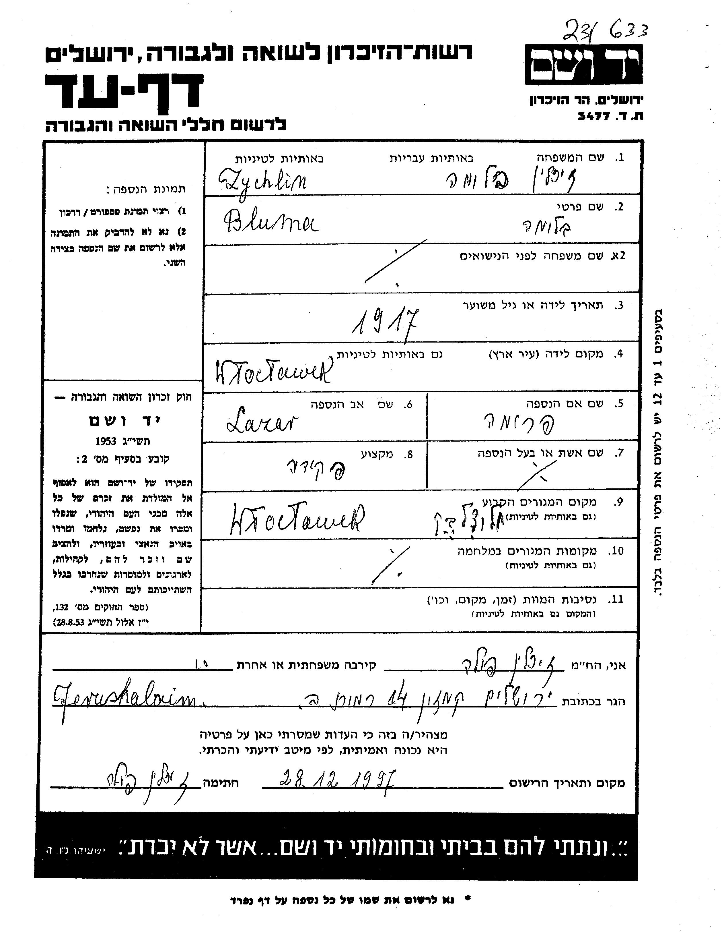 Bluma Zychlin wurde im Jahr 1917 in Wloclawek, Polen geboren. Sie war die Tochter von Eliezer und Fruma, geb. Zychlinski. Sie war Angestellte/-r. Vor dem Zweiten Weltkrieg lebte sie in Wloclawek, Polen.