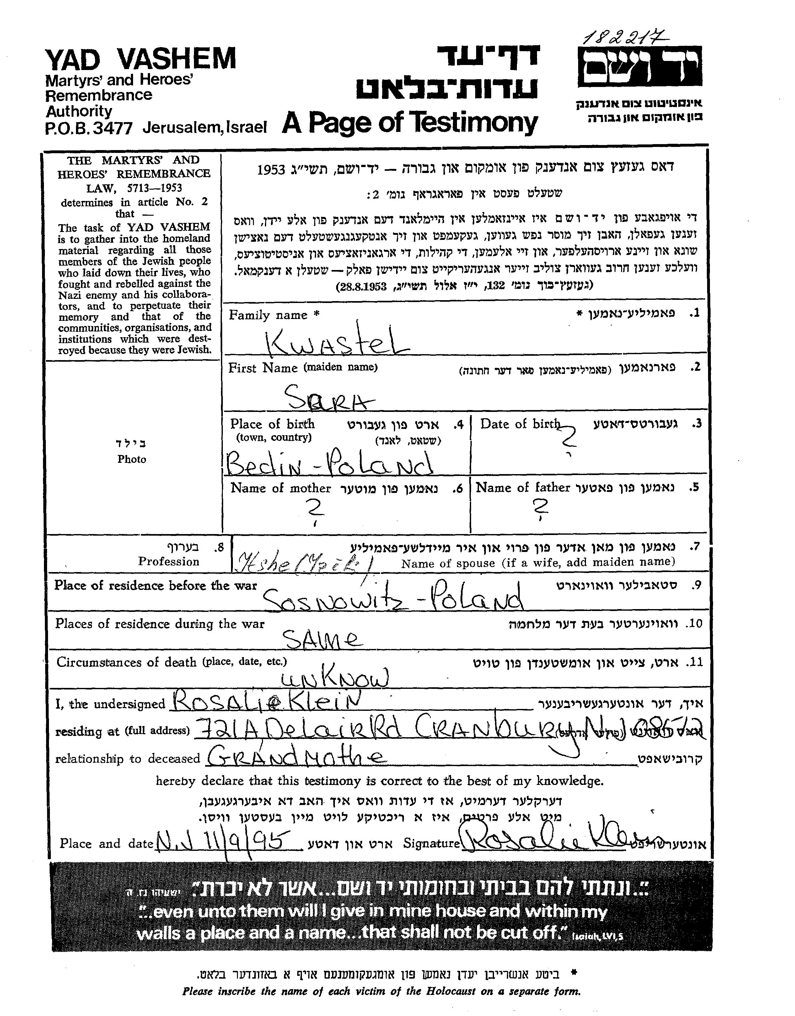Kwastel Sara Sosnowiec, Polen Gedenkblatt