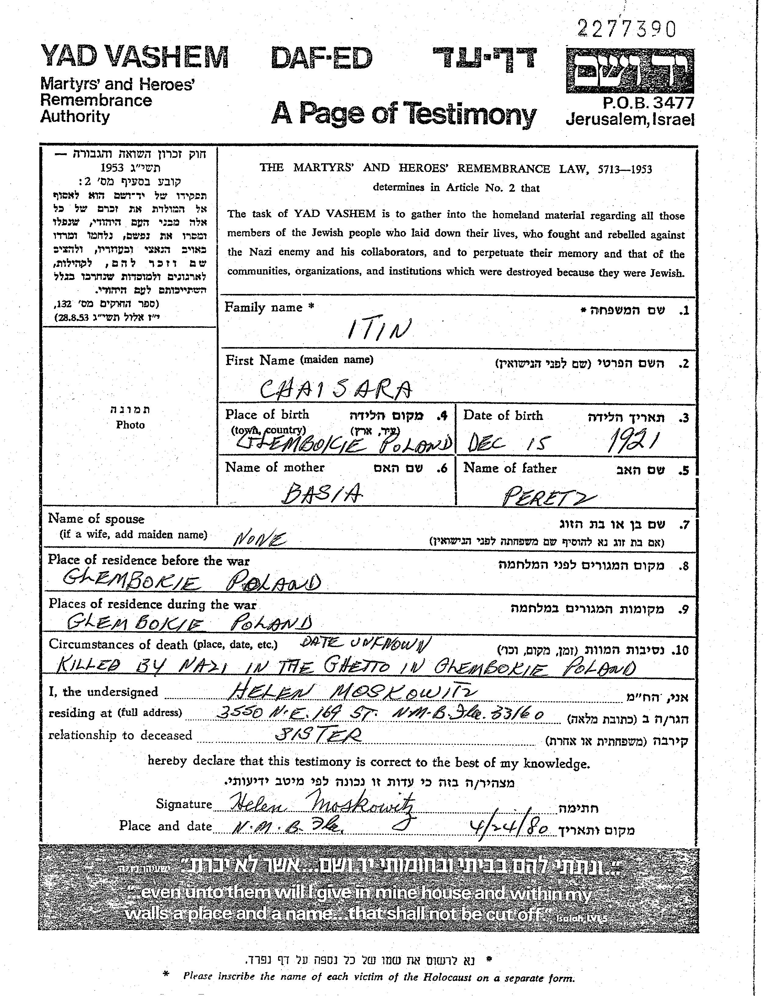 Chaisara Itin wurde im Jahr 1921 in Glembokie, Polen geboren. Sie war die Tochter von Peretz und Basia, geb. Tilles. Sie war Ledig. Vor dem Zweiten Weltkrieg lebte sie in Glembokie, Polen. Während des Krieges war sie in Glembokie, Polen.