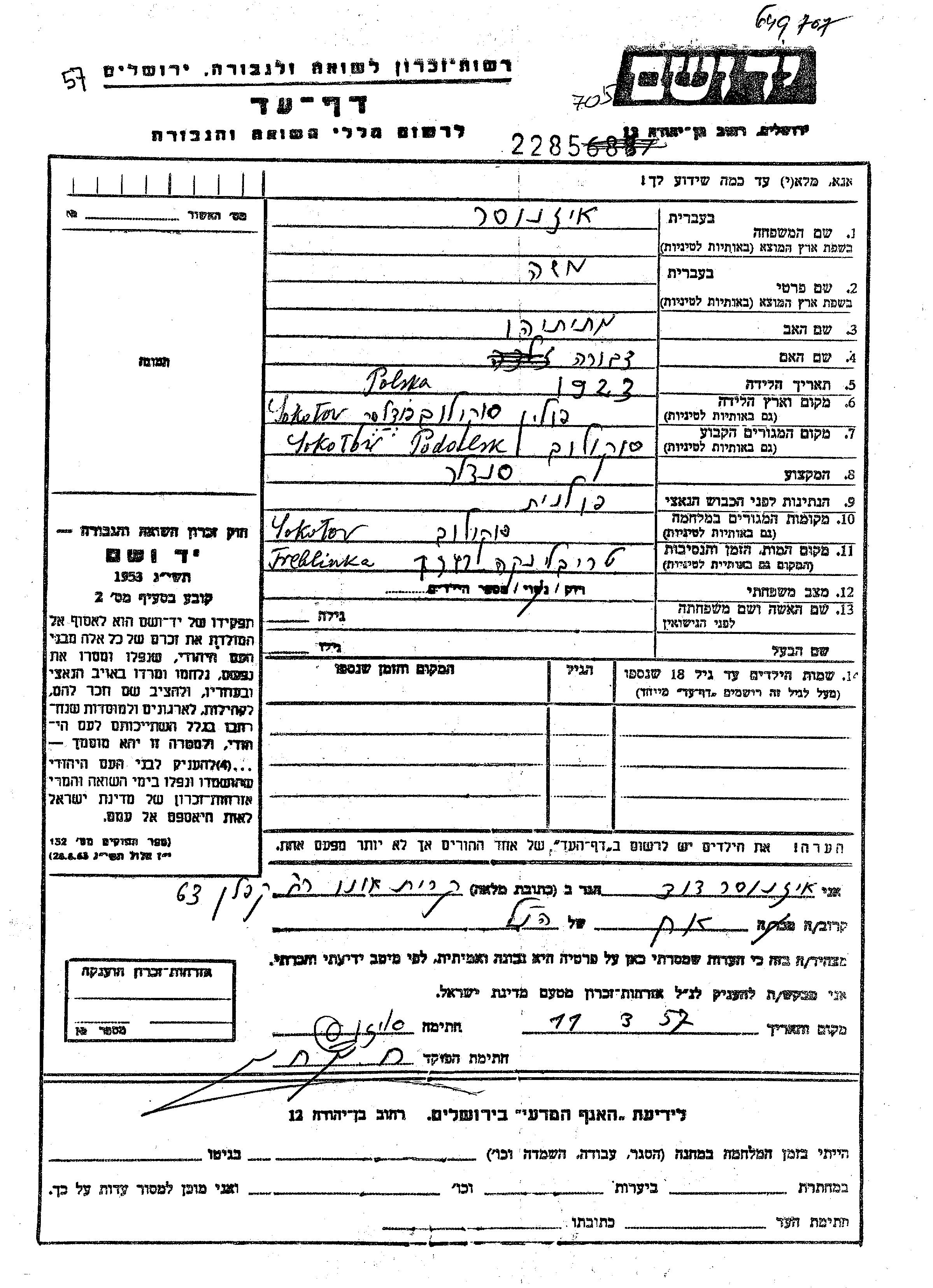 Moshe Ajzenwaser wurde im Jahr 1923 in Sokolow Podlaski, Polen geboren. Er war der Sohn von Matatiahu und Dvora. Er war Ledig. Vor dem Zweiten Weltkrieg lebte er in Sokolow Podlaski, Polen. Während des Krieges war er in Sokolow Podlaski, Polen.