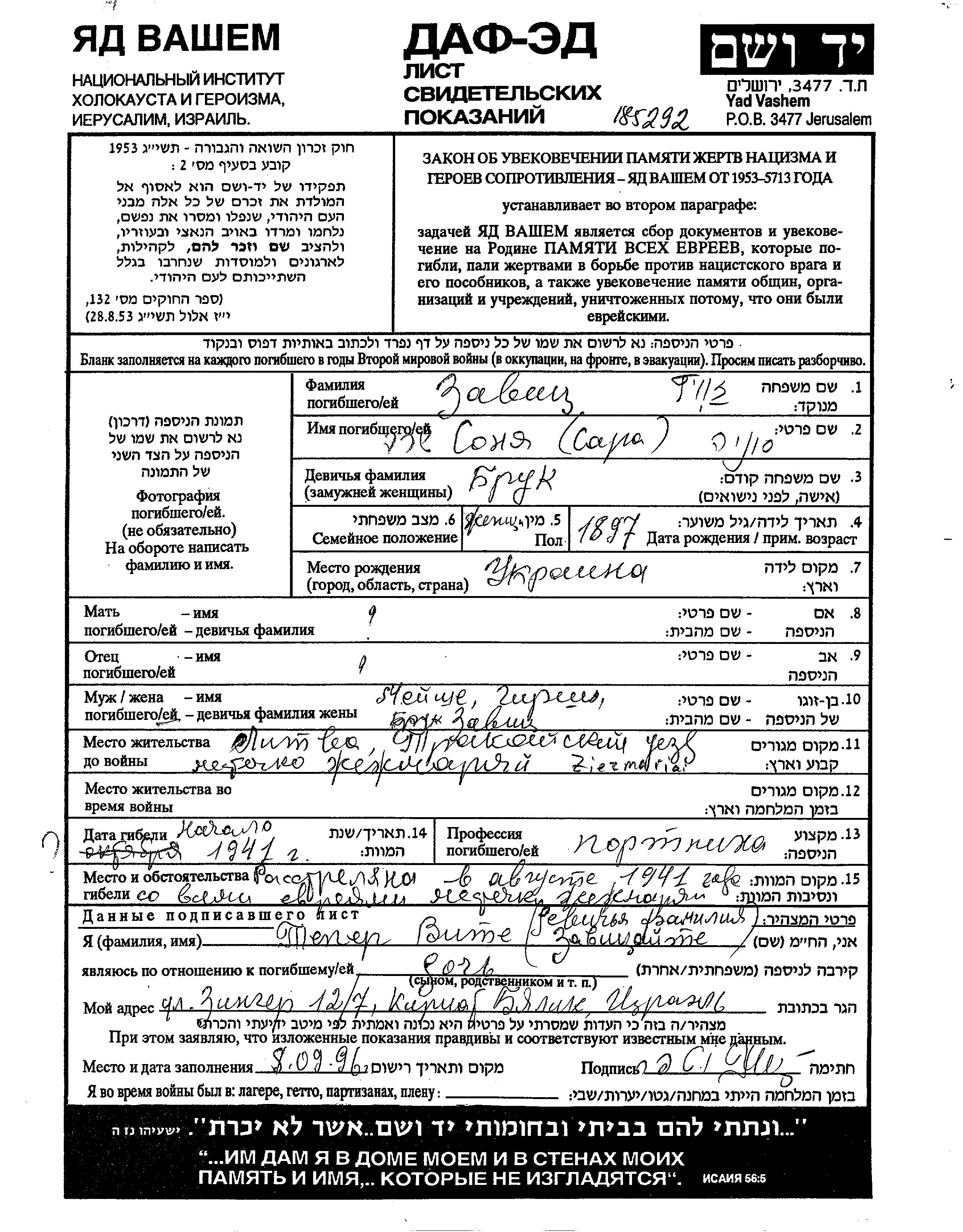 Sonya Sara Zavitz, geb. Bruk wurde im Jahr 1897 in Ukraine (UdSSR) geboren. Sie war Schneiderin und mit Meishe Hirsh Verheiratet. Vor dem Zweiten Weltkrieg lebte sie in Ziezmariai, Litauen. Während des Krieges war sie in Ziezmariai, Litauen.