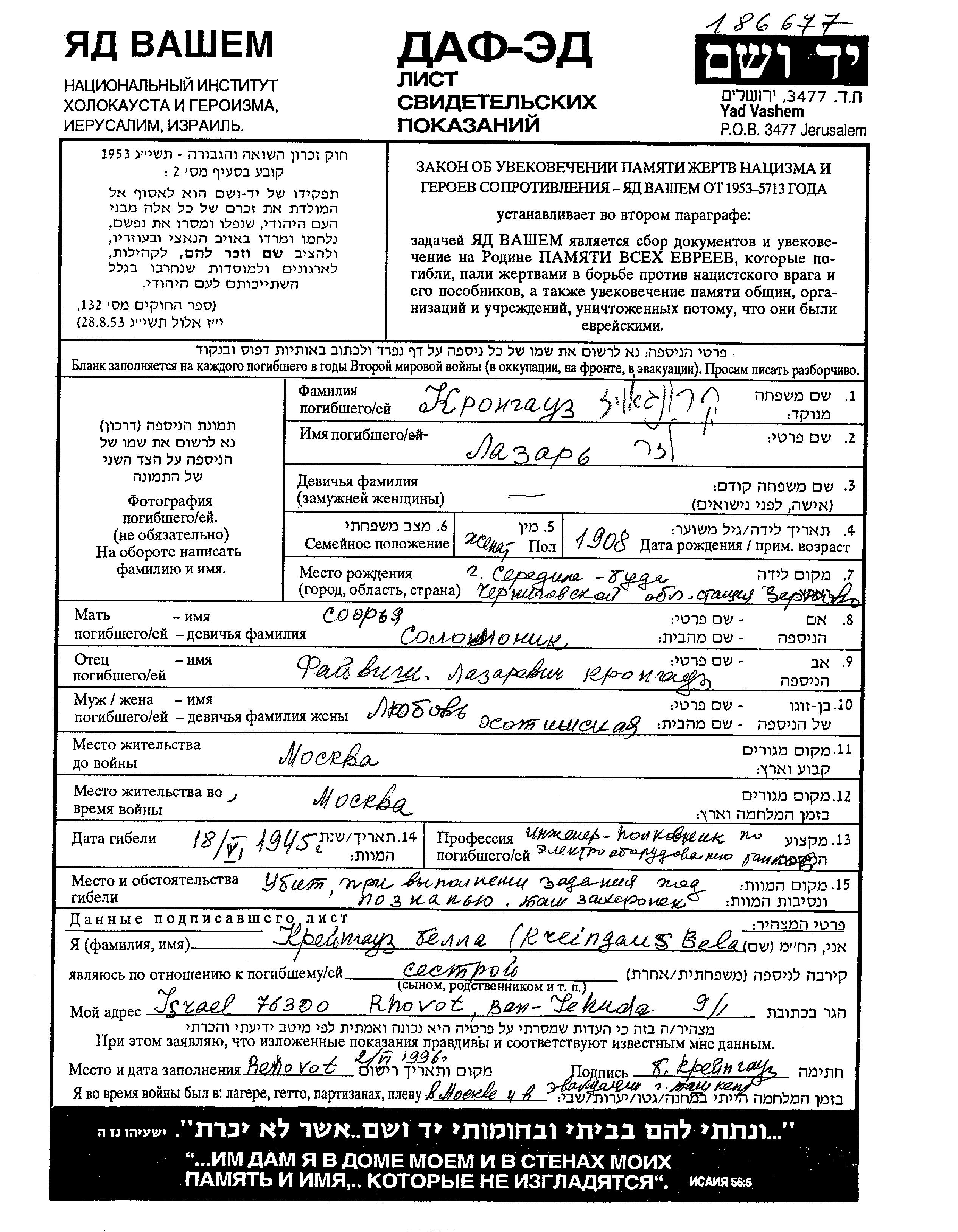 Lazar Krongauz wurde im Jahr 1908 in Seredina Buda, Ukraine (UdSSR) geboren. Er war der Sohn von Faivish und Sofya, geb. Solomonik. Er war Offizier und mit Lyubov Verheiratet. Vor dem Zweiten Weltkrieg lebte er in Moskva, Russland (UdSSR). Während des Krieges war er in die Sowjetischen Streitkräfte. Lazar im Militärdienst umgekommen. Todesort: Poznan, Polen im Jahr 18/06/1945.
