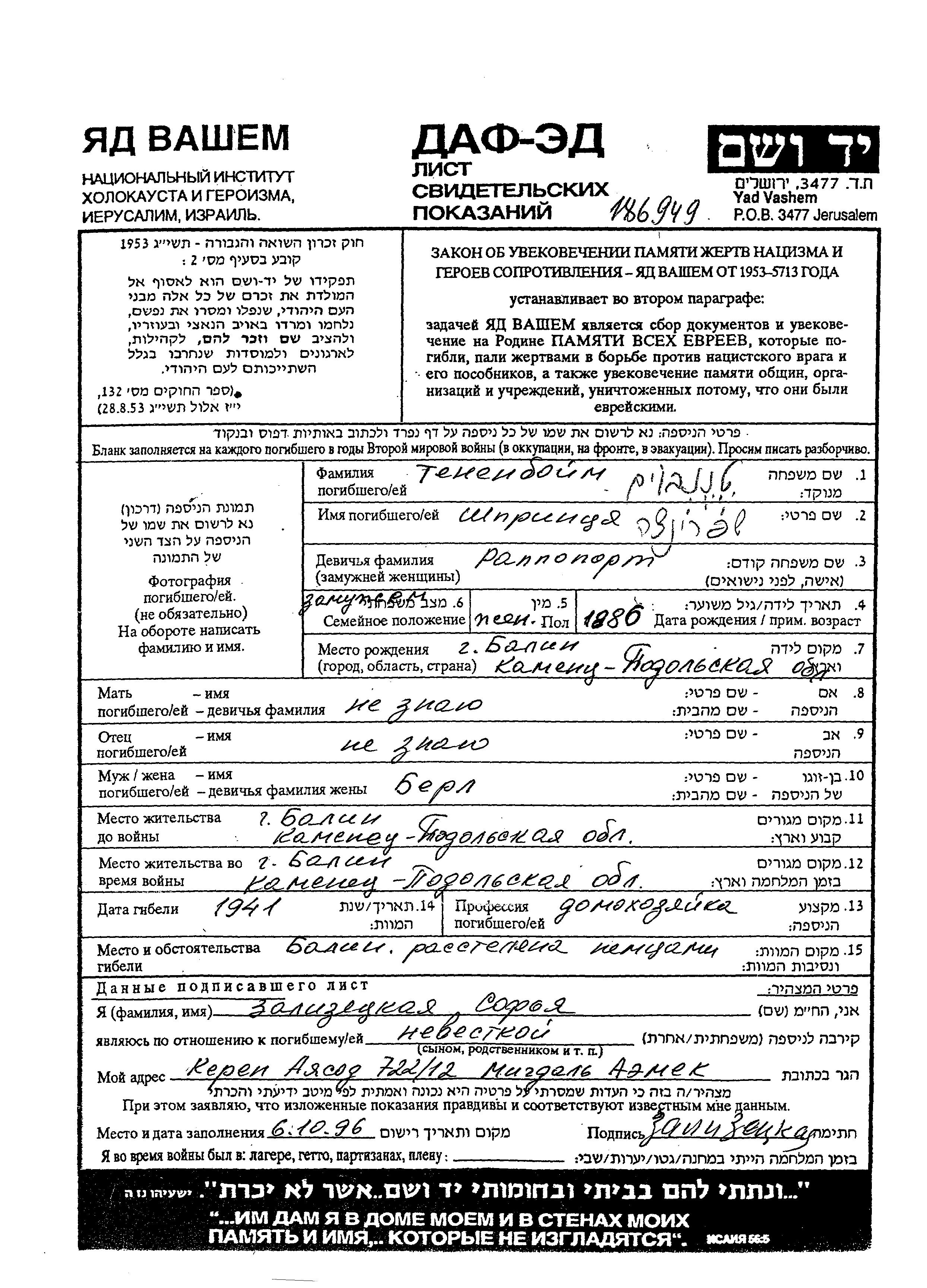 Shprintzya Tenenboim, geb. Rapoport wurde im Jahr 1886 in Balin, Ukraine (UdSSR) geboren. Sie war die Tochter von Hirsh. Sie war Hausfrau und mit Berl Verheiratet. Vor dem Zweiten Weltkrieg lebte sie in Balin, Ukraine (UdSSR). Während des Krieges war sie in Balin, Ukraine (UdSSR).