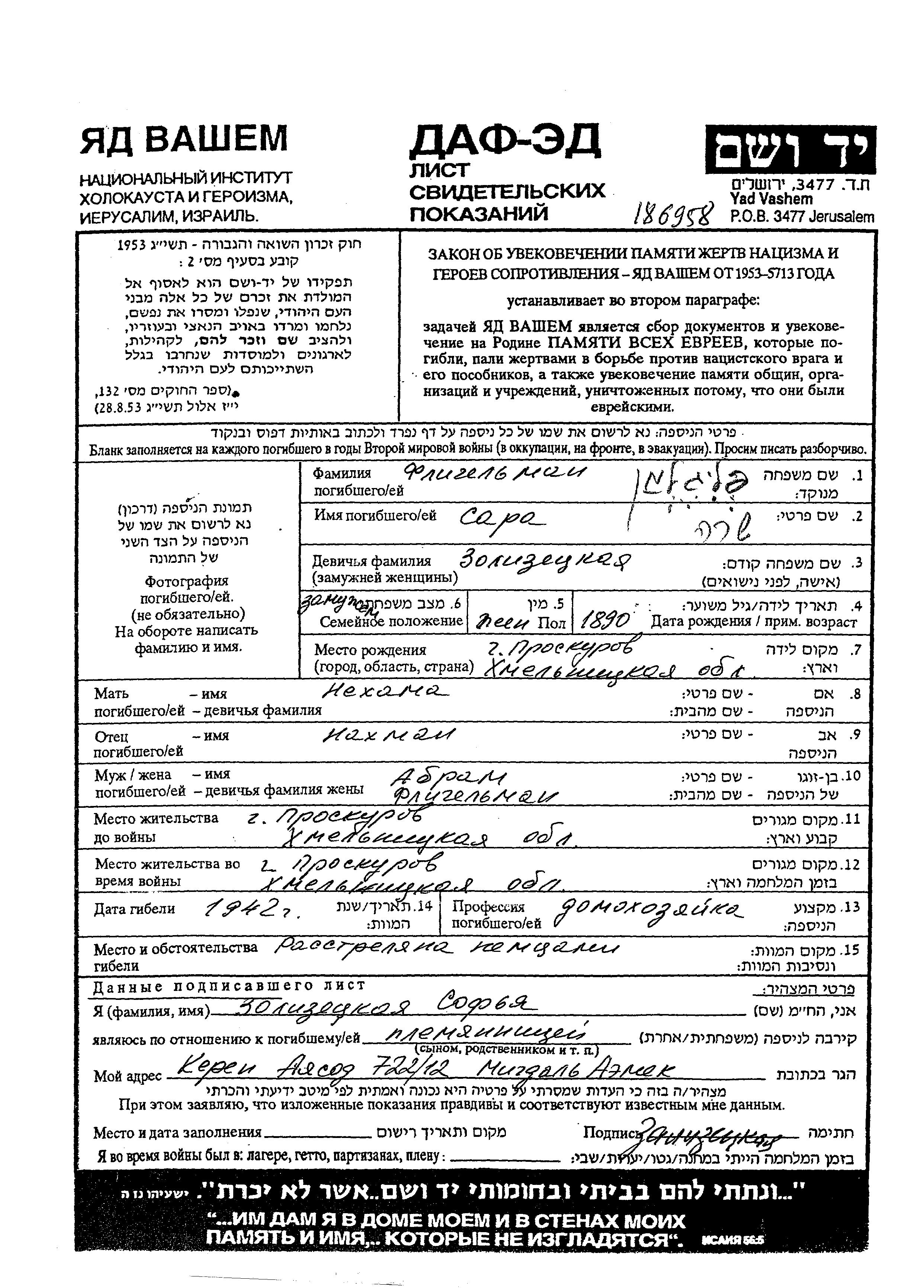 Sara Fligelman, geb. Zolizetzkaya wurde im Jahr 1890 in Proskurov, Ukraine (UdSSR) geboren. Sie war die Tochter von Nakhman und Nekhama. Sie war Hausfrau und mit Abram Verheiratet. Vor dem Zweiten Weltkrieg lebte sie in Proskurov, Ukraine (UdSSR). Während des Krieges war sie in Proskurov, Ukraine (UdSSR).